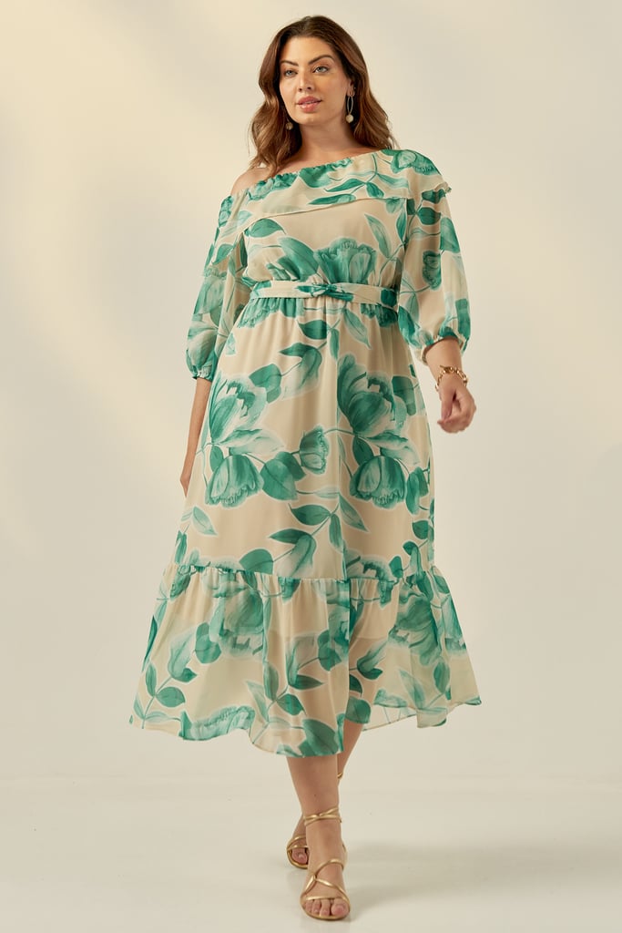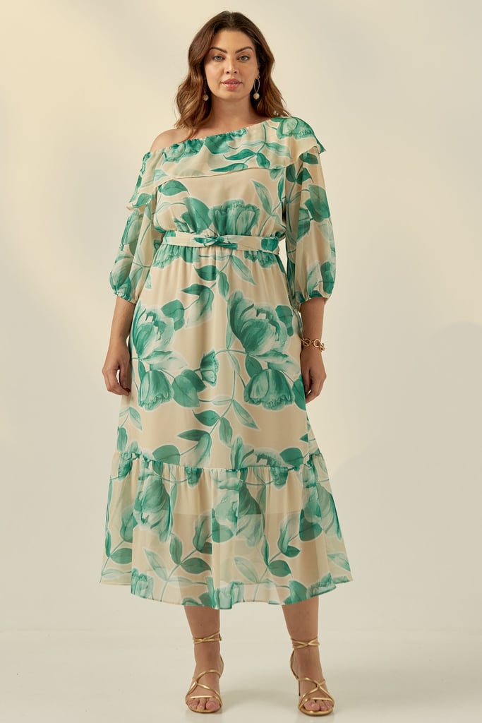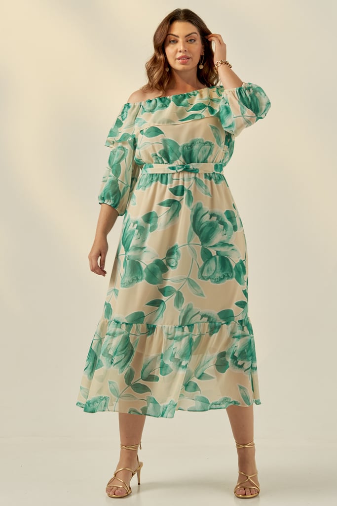 Vestido confeccionado em tecido de chiffon com padronagem floral exclusiva. Possui decote assimétrico com babado e manga 3/4 com terminação de elástico. Saia midi com babado na barra. Acompanha faixa do mesmo tecido para amarração. Peça forrada.