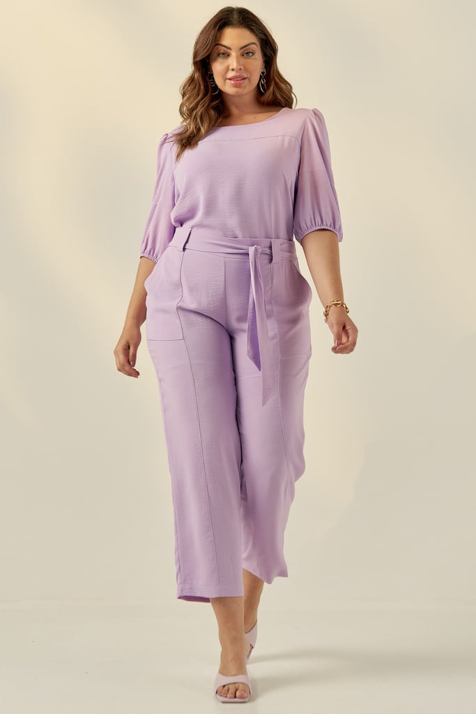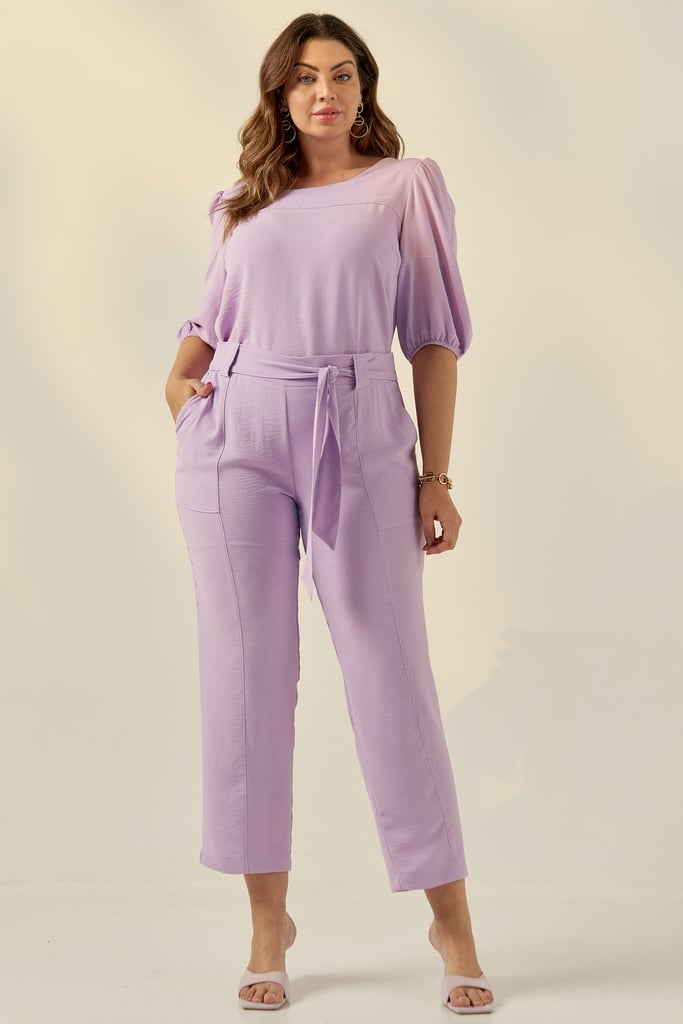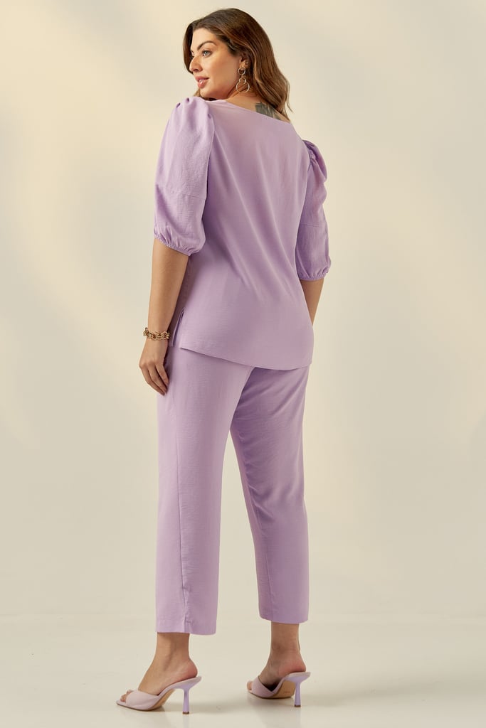Conjunto confeccionado em tecido de crepe texturizado com detalhe de pesponto. Blusa possui decote redondo e manga bufante com terminação de elástico. Calça traz nossa modelagem clássica reta com bolsos frontais, faixas fixadas na laterais para amarração e cós com elástico nas costas para maior conforto.