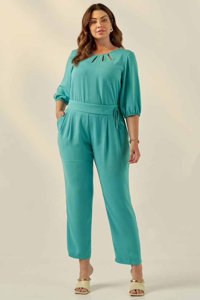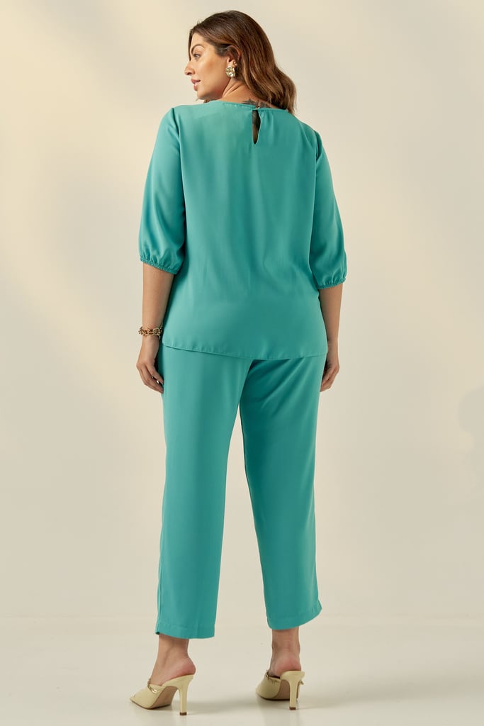 Conjunto confeccionado em tecido de crepe liso. Blusa possui decote arredondado com recortes vazados em formato de pétalas, mangas 3/4 com terminação de elástico e fechamento por botão nas costas. Calça traz nossa modelagem clássica reta com bolsos laterais, cós frontal com detalhe de amarração e costas com elástico para maior conforto.
