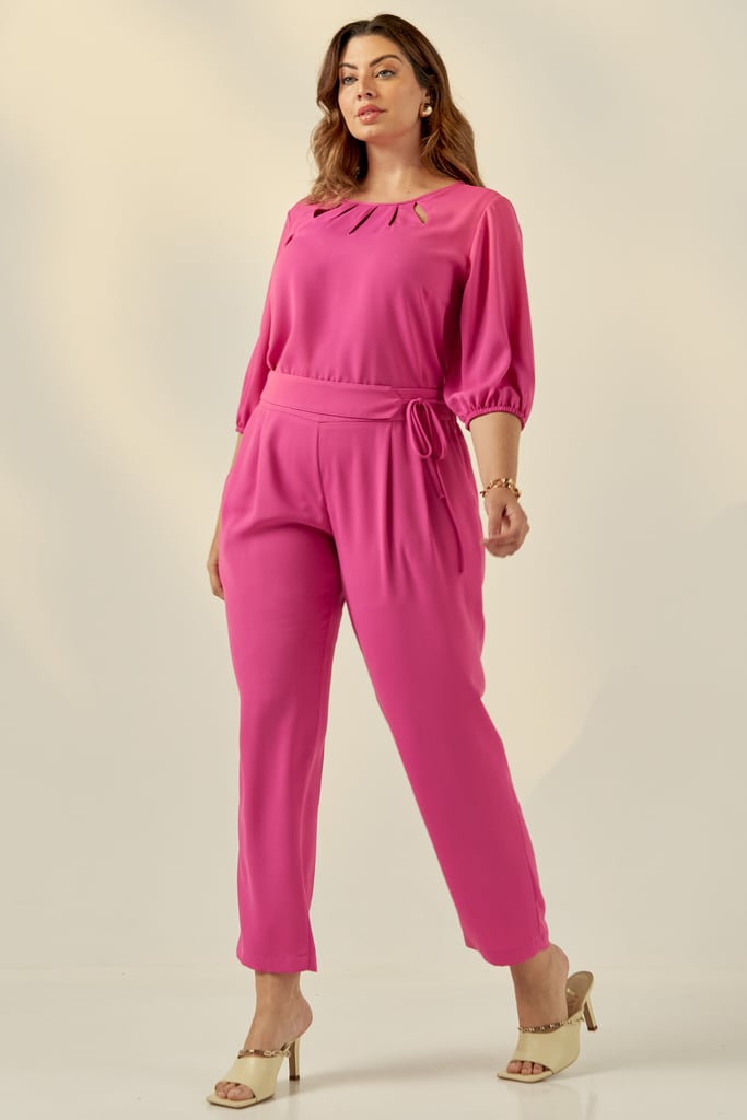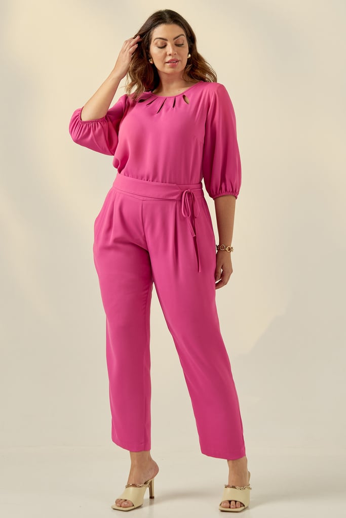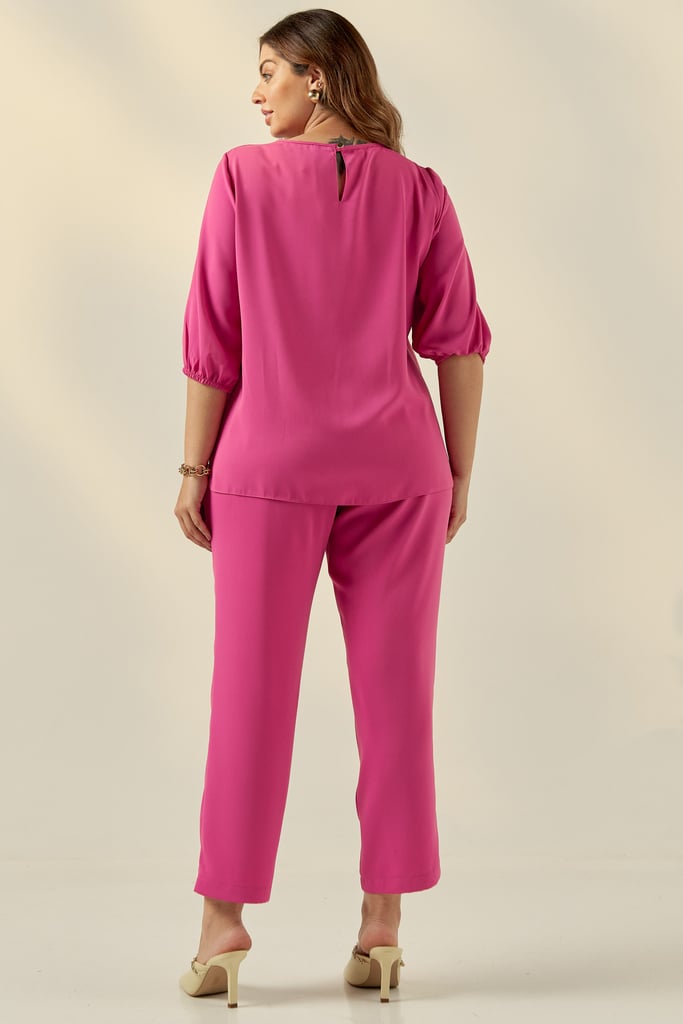 Conjunto confeccionado em tecido de crepe liso. Blusa possui decote arredondado com recortes vazados em formato de pétalas, mangas 3/4 com terminação de elástico e fechamento por botão nas costas. Calça traz nossa modelagem clássica reta com bolsos laterais, cós frontal com detalhe de amarração e costas com elástico para maior conforto.