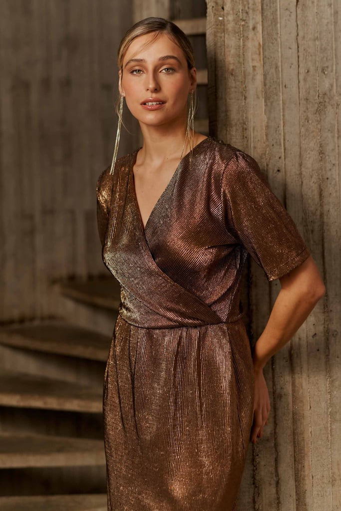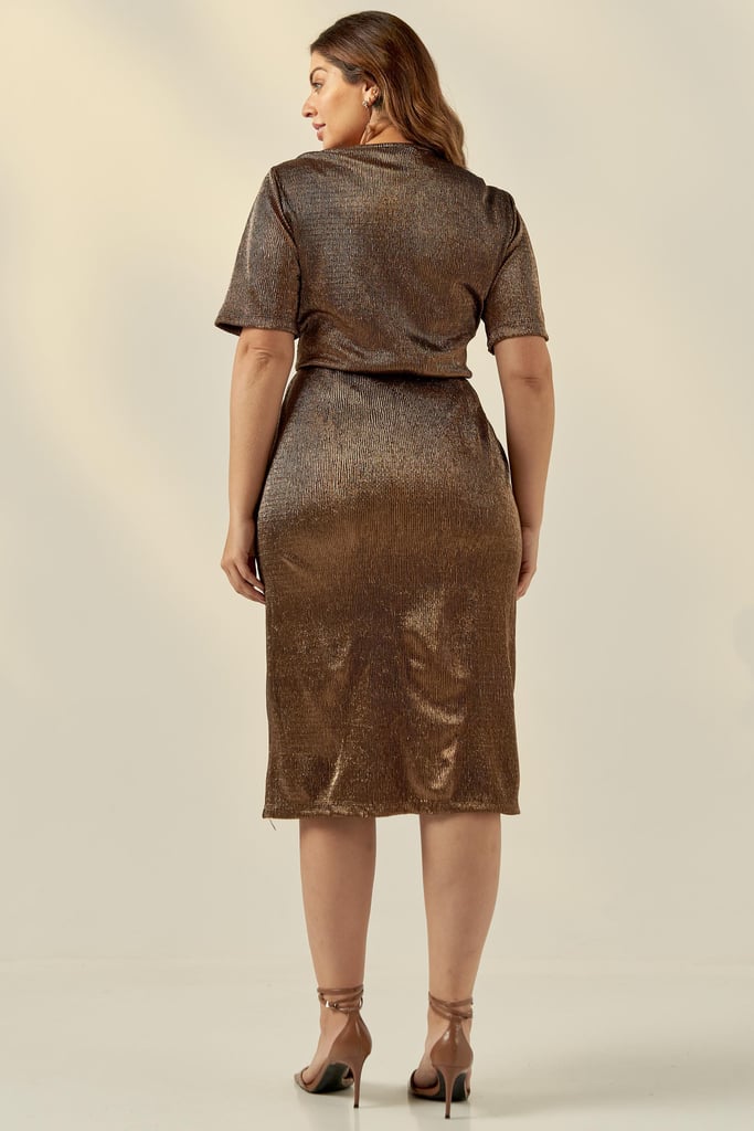 Vestido confeccionado em malha metalizada. Possui decote transpassado, manga curta, elástico interno na cintura para maior conforto e comprimento midi.