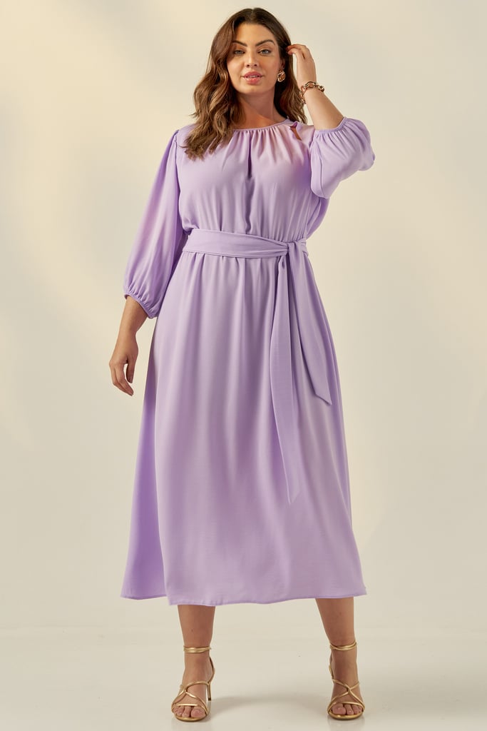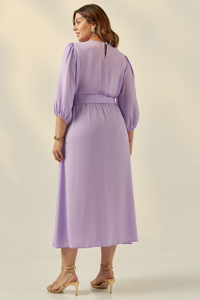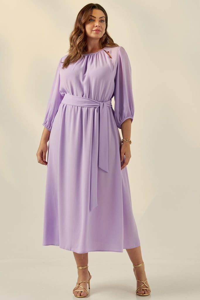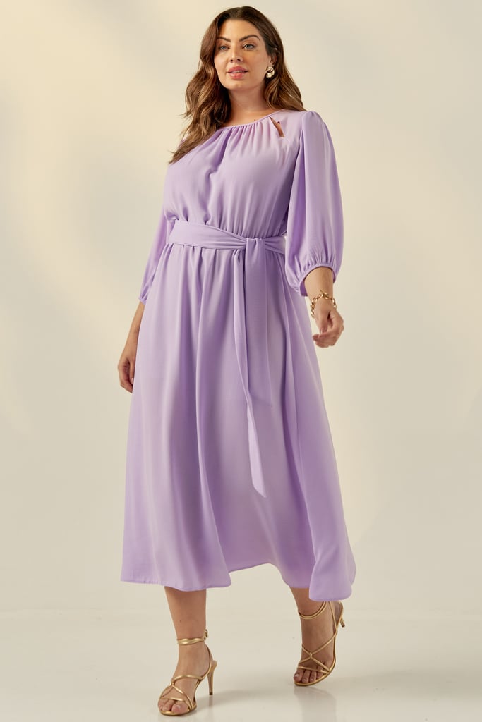 Vestido confeccionado em tecido de crepe liso. Possui decote redondo com leve frazido e detalhe frontal de recortes vazados que dão um ar moderno à peça. Mangas 3/4. Cintura com elástico interno para maior conforto e efeito blusê. Comprimento midi. Acompanha faixa do mesmo tecido para amarração.