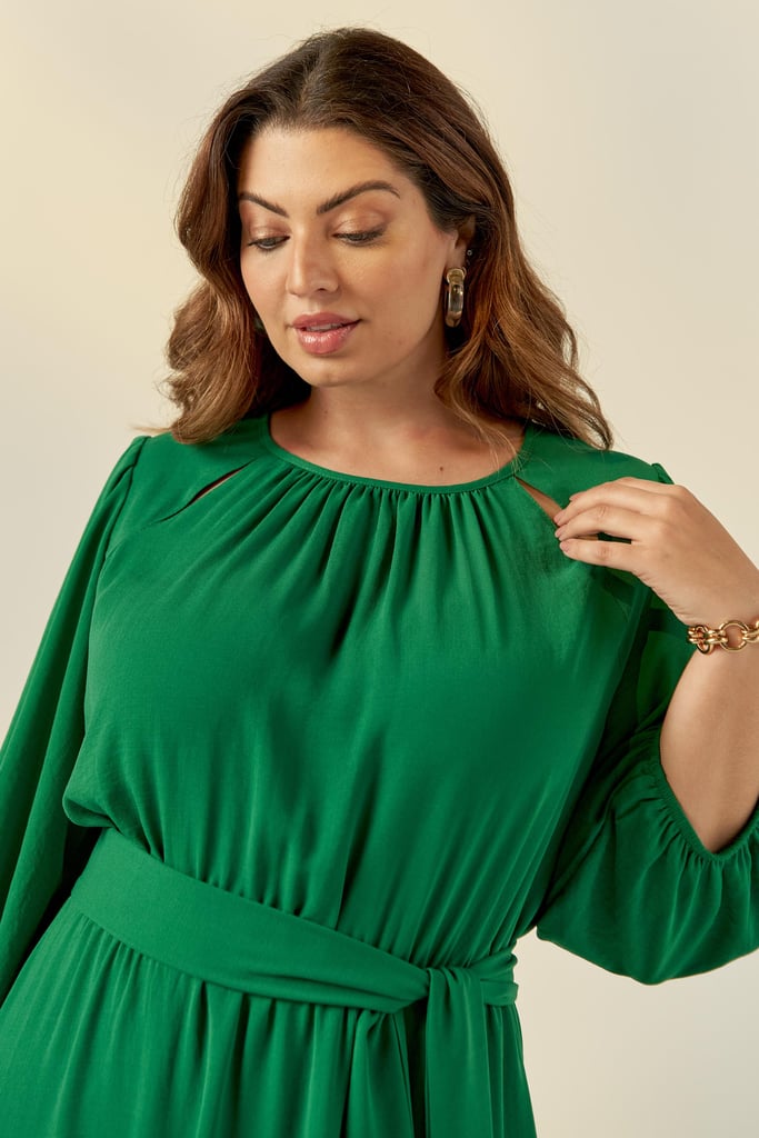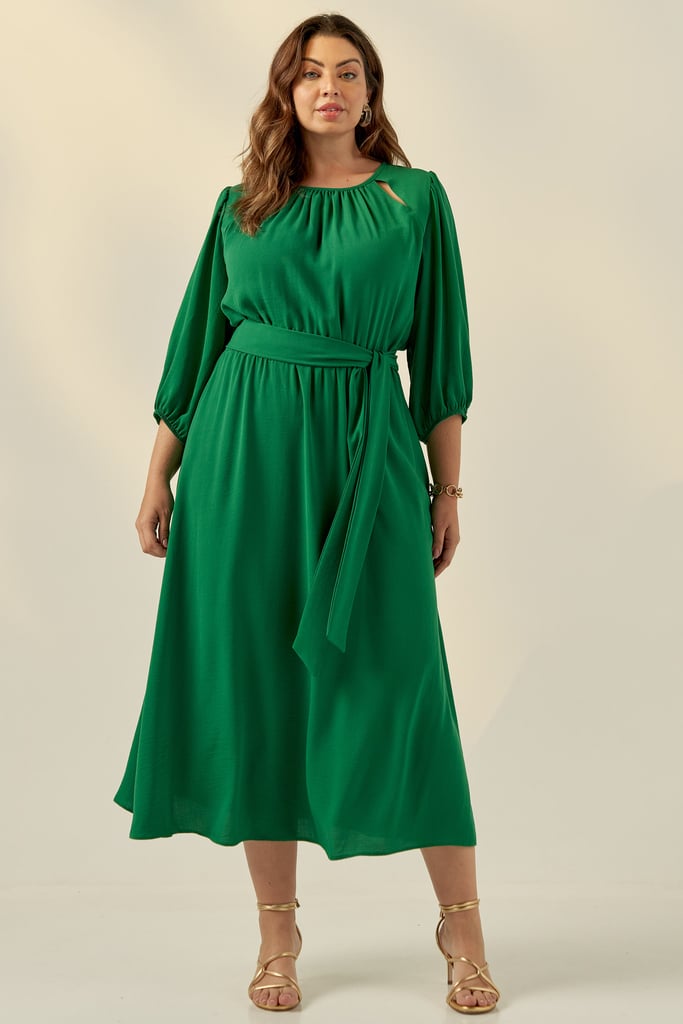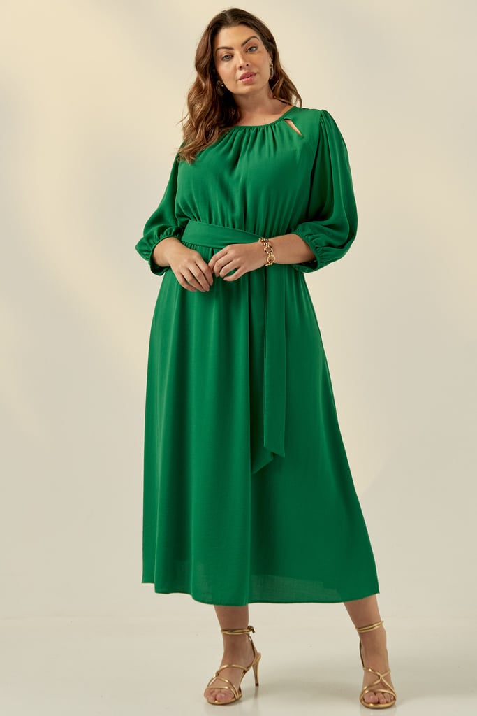 Vestido confeccionado em tecido de crepe liso. Possui decote redondo com leve frazido e detalhe frontal de recortes vazados que dão um ar moderno à peça. Mangas 3/4. Cintura com elástico interno para maior conforto e efeito blusê. Comprimento midi. Acompanha faixa do mesmo tecido para amarração.