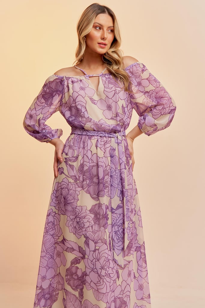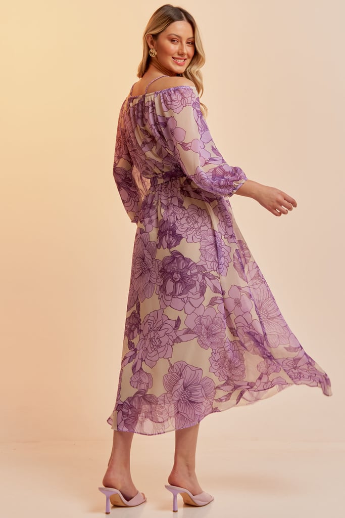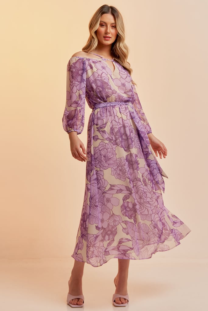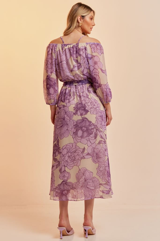 Vestido confeccionado em tecido de chiffon com estampa floral exclusiva. Possui decote versátil com tiras finas que dão todo charme à peça. Manga 3/4 com terminação de elástico. Elástico na cintura para efeito blusê. Acompanha faixa do mesmo tecido para amarração. Peça forrada.