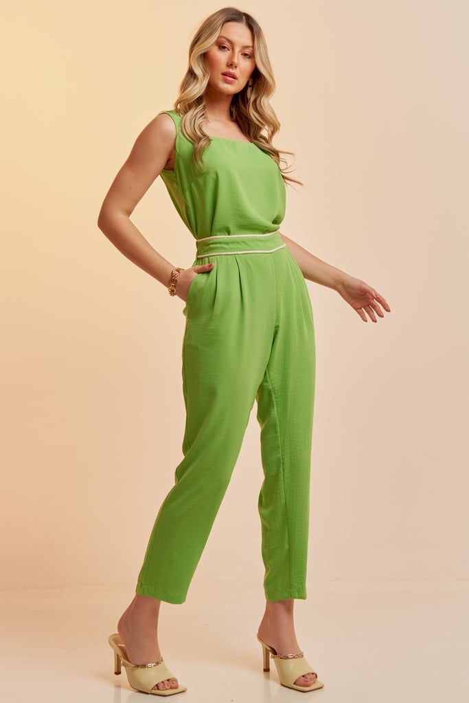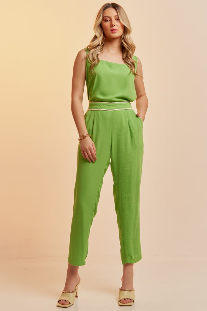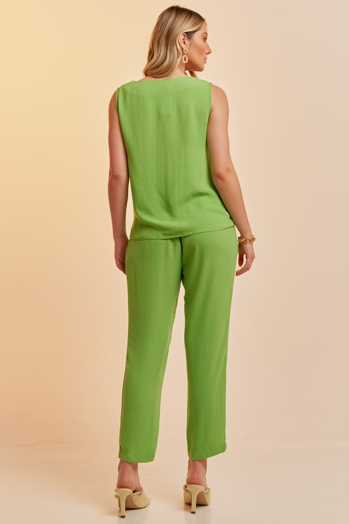 Conjunto confeccionado em tecido de crepe liso. Blusa sem manga com decote quadrado. Calça traz nossa modelagem clássica reta com acabamento de corda no cós frontal que dá todo charme à peça. Possui bolsos laterais com cós com elástico nas costas para maior conforto