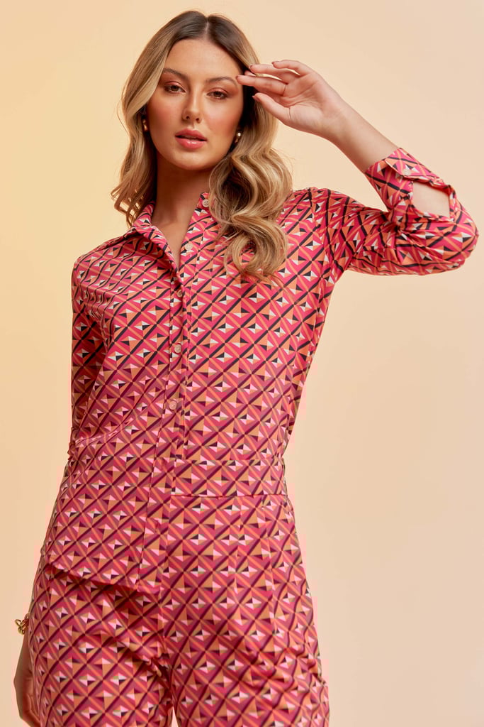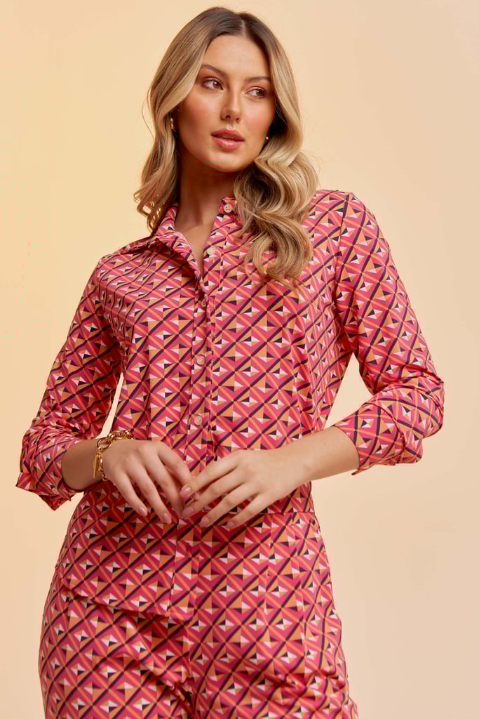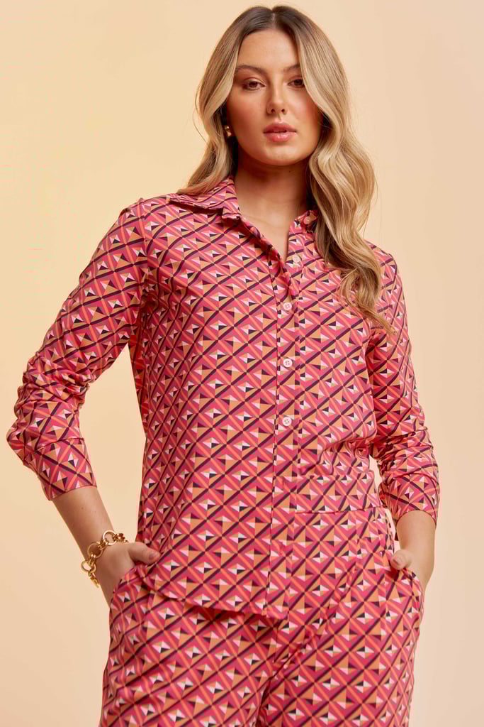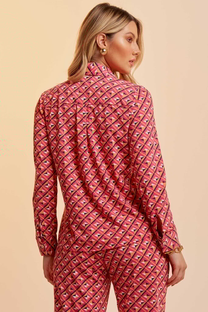 Camisa confeccionada em tecido de Fluity com estamparia exclusiva. Possui gola de camisa, vista frontal com fechamento por botões e manga comprida com punho