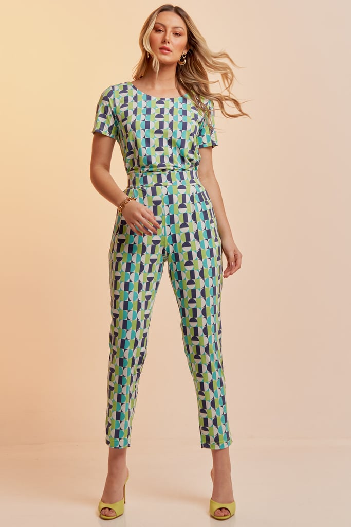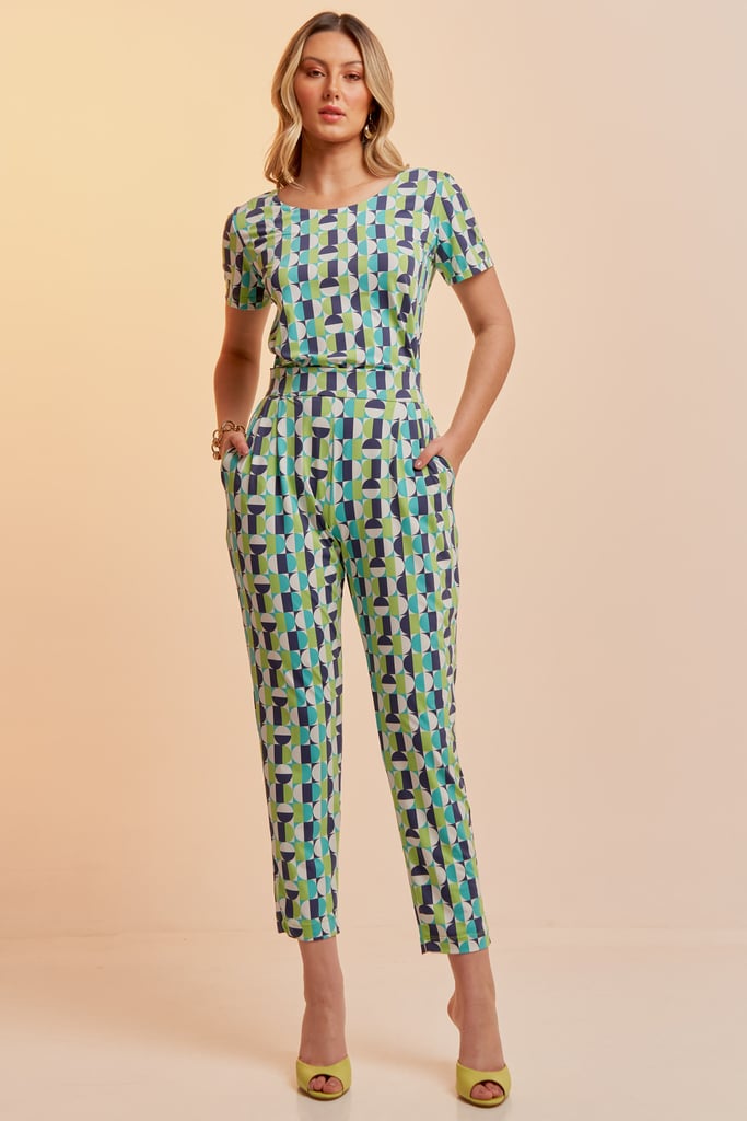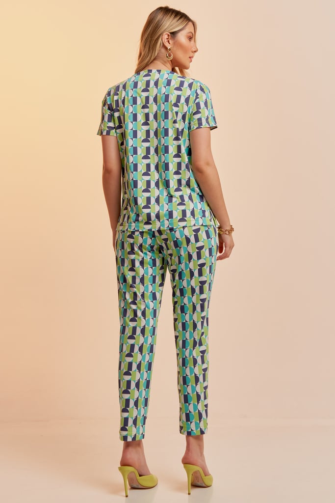 Conjunto de blusa e calça confeccionado em Fluity com estamparia exclusiva. Blusa possui decote redondo e manga curta. Calça traz nossa modelagem clássica reta com pregas frontais, bolsos laterais e cós com elástico nas costas para garantir conforto à peça