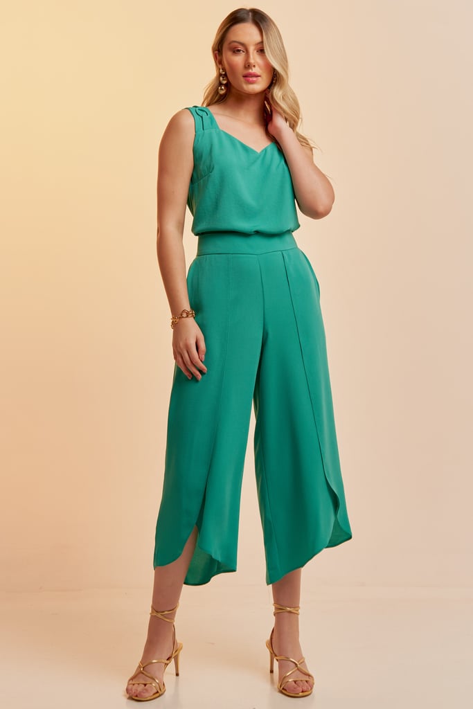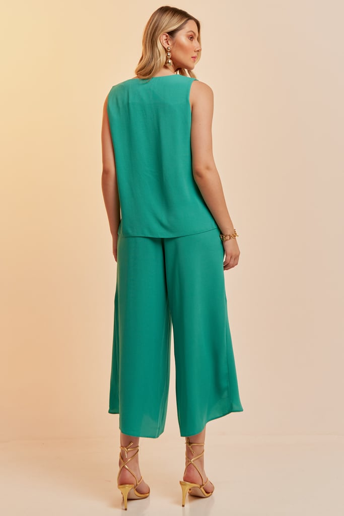 Conjunto confeccionado em tecido de crepe liso encorpado. Blusa possui decote princesa com detalhe de argola forrada nas alças; Calça estilo pantacourt transpassada, bolsos laterais e cós com elástico nas costas para maior conforto