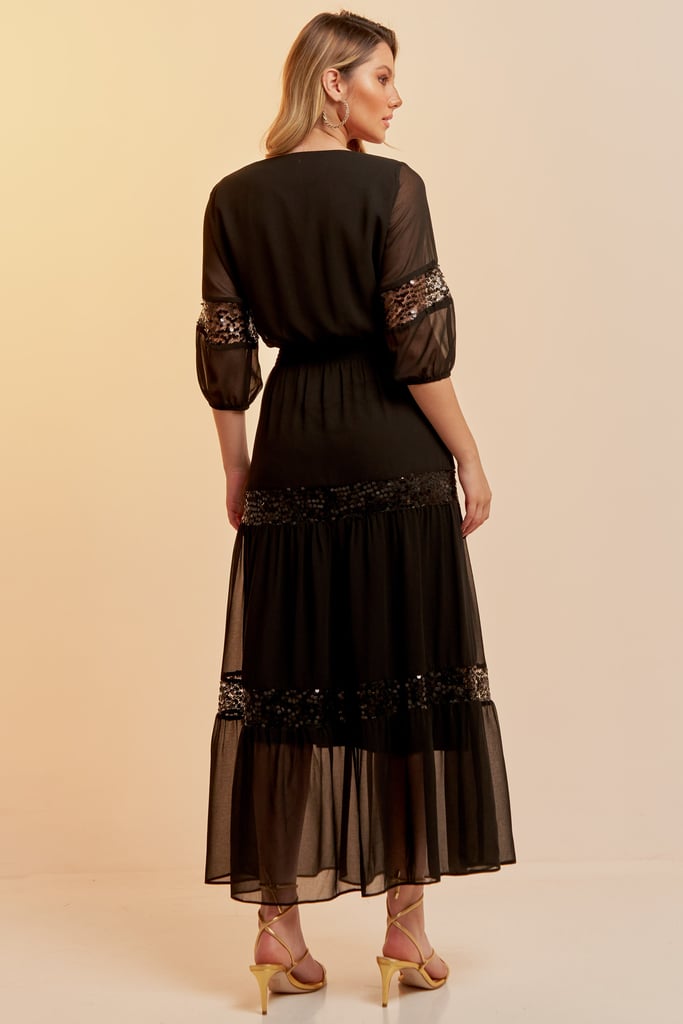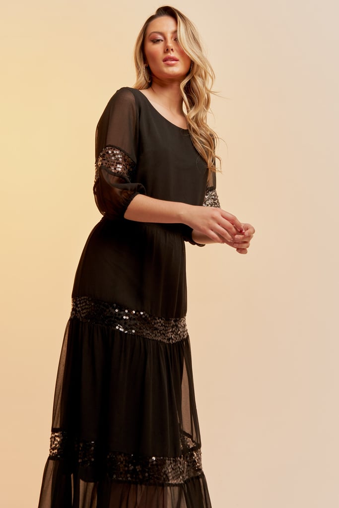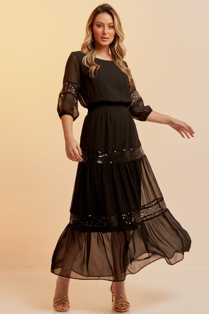 Vestido confeccionado em tecido de chiffon com recortes de paetê. Possui decote arredondado, manga bufante com terminação de elástico, detalhe de lastex na cintura para efeito blusê e saia midi em camadas. Peça forrada. Perfeito para ocasiões sociais e festivas!