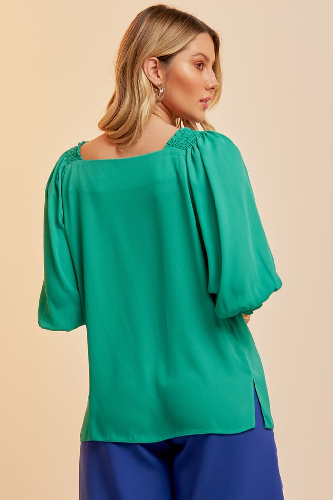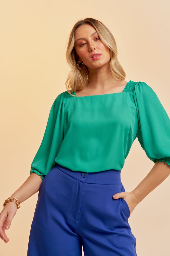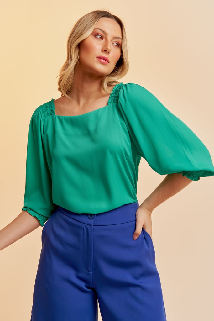 Blusa confeccionada em tecido de crepe liso. Possui decote quadrado com trabalho de lastex no ombro e punho. Manga bufante 3/4. Aquela peça básica essencial para compor looks estilosos!