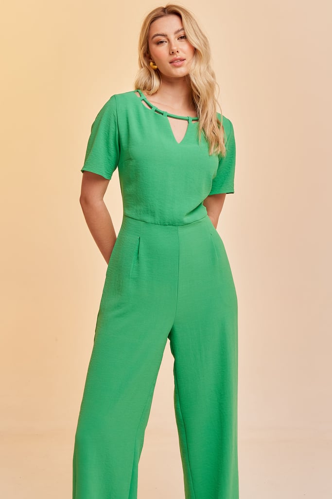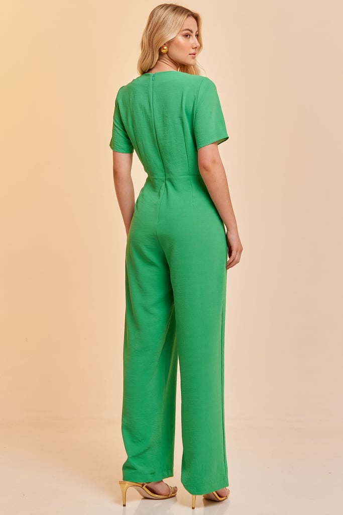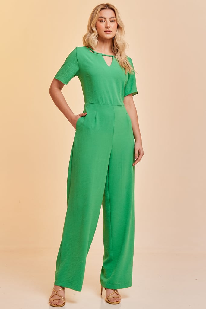 Macacão longo confeccionado em tecido de crepe. Possui decote redondo com tira e passantes. Manga curta. Bolsas laterais. Fechamento por zíper nas costas.