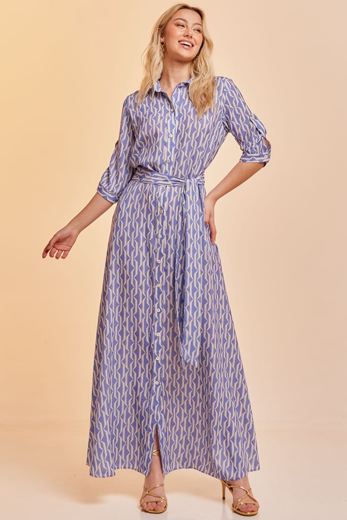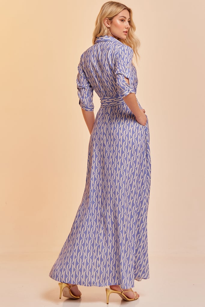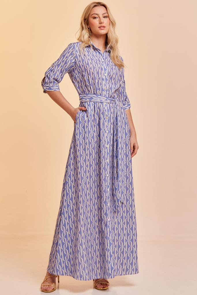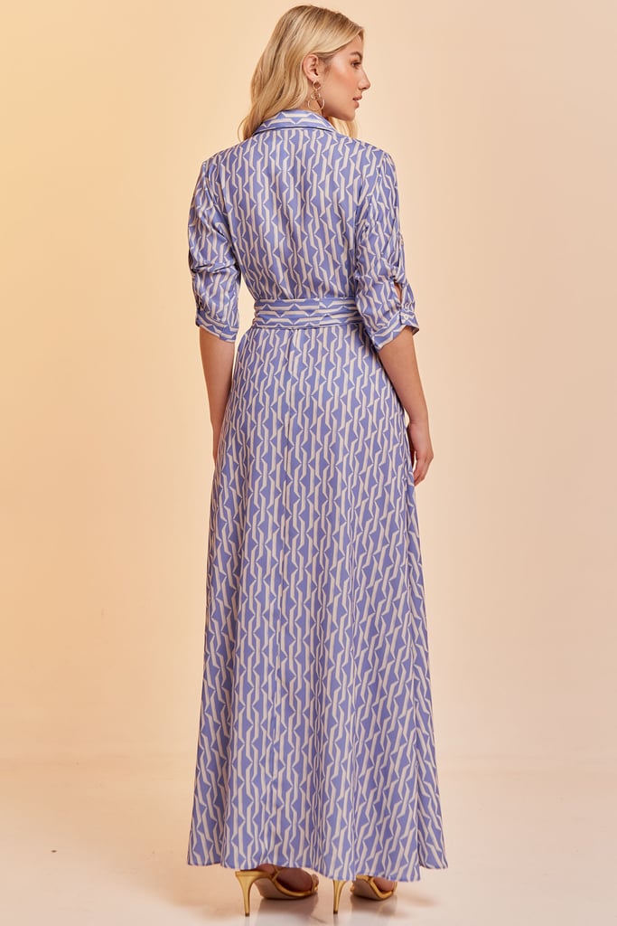 Chemise longa confeccionada em tecido de crepe com estamparia exclusiva. Possui gola de camisa, vista frontal com botões e bolsos laterais. Manga 3/4 com punho e martingale. Acompanha faixa do mesmo tecido para amarração.