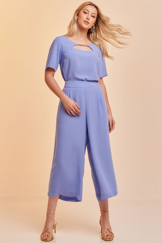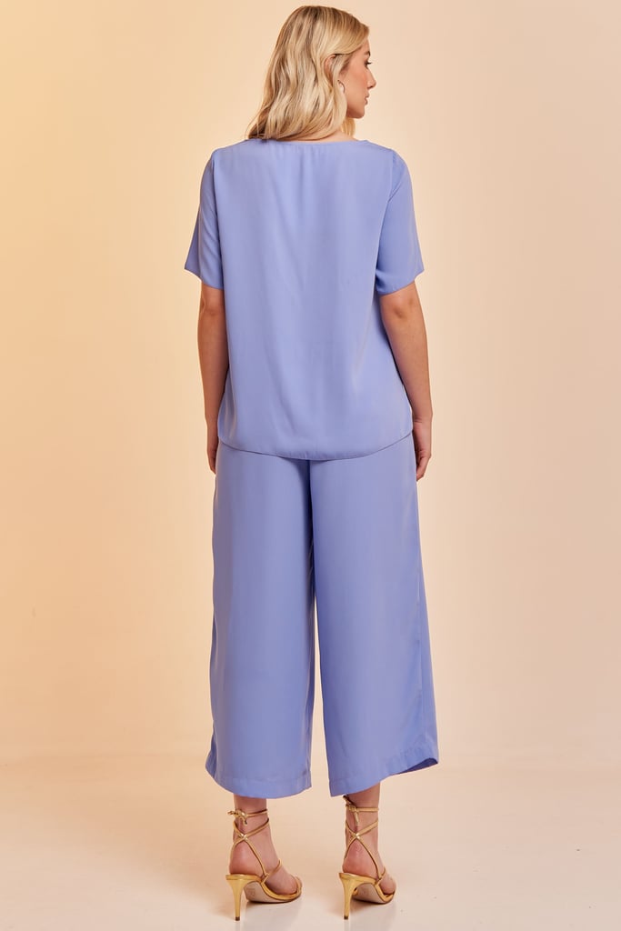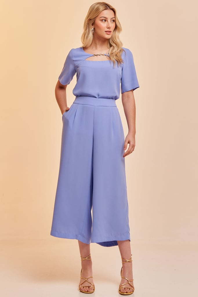 Conjunto de blusa e calça confeccionado em tecido de crepe. Blusa possui abertura com aviamento no decote e manga curta. Calça estilo pantacourt com pregas frontais, bolsos laterais e cós com elástico nas costas para maior conforto