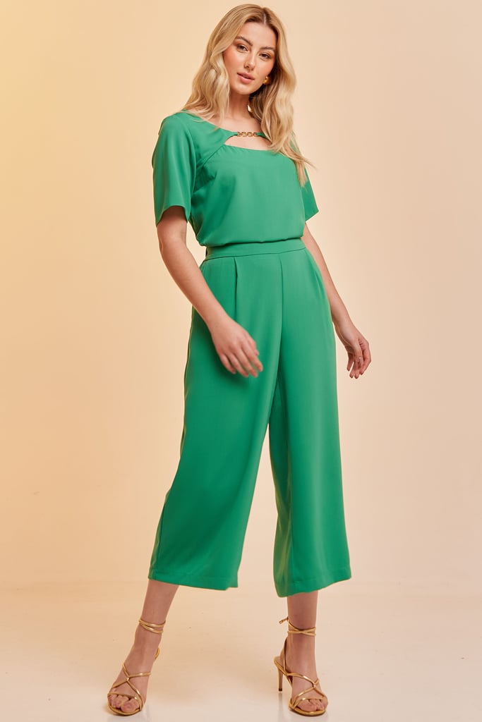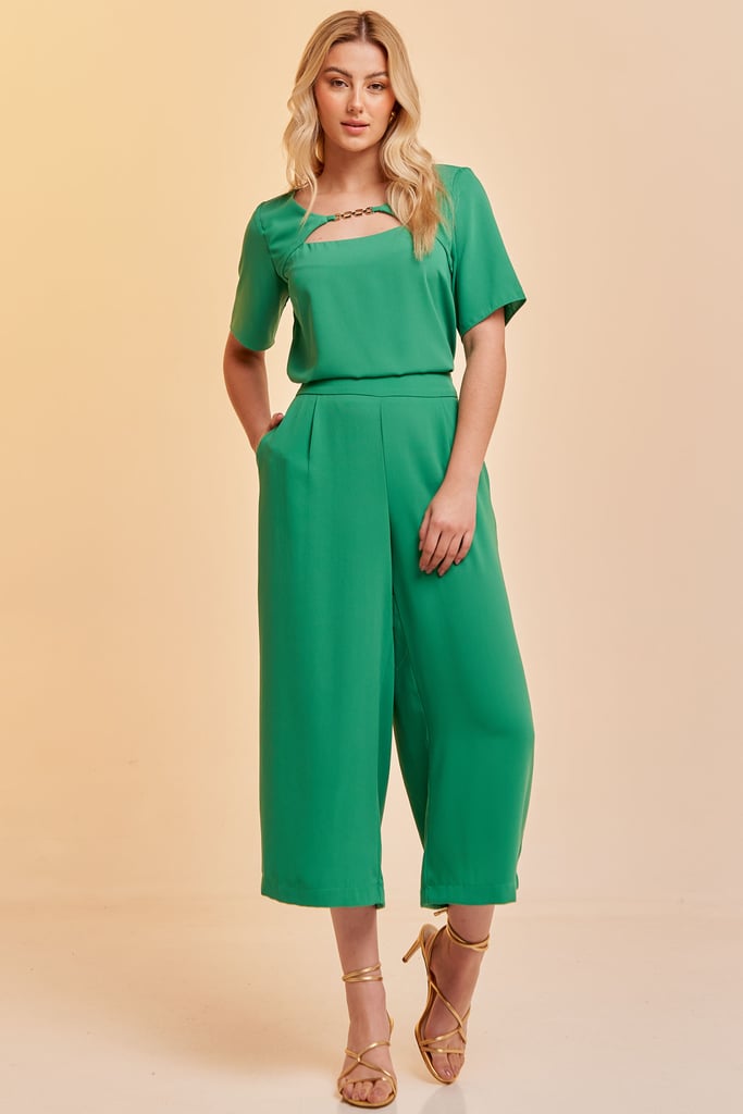 Conjunto de blusa e calça confeccionado em tecido de crepe. Blusa possui abertura com aviamento no decote e manga curta. Calça estilo pantacourt com pregas frontais, bolsos laterais e cós com elástico nas costas para maior conforto