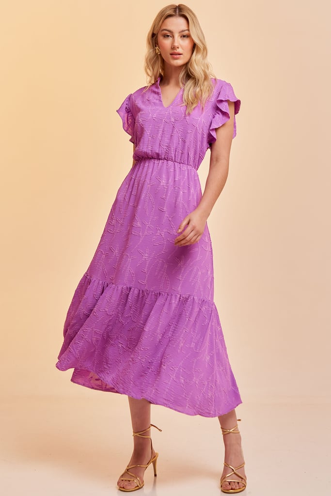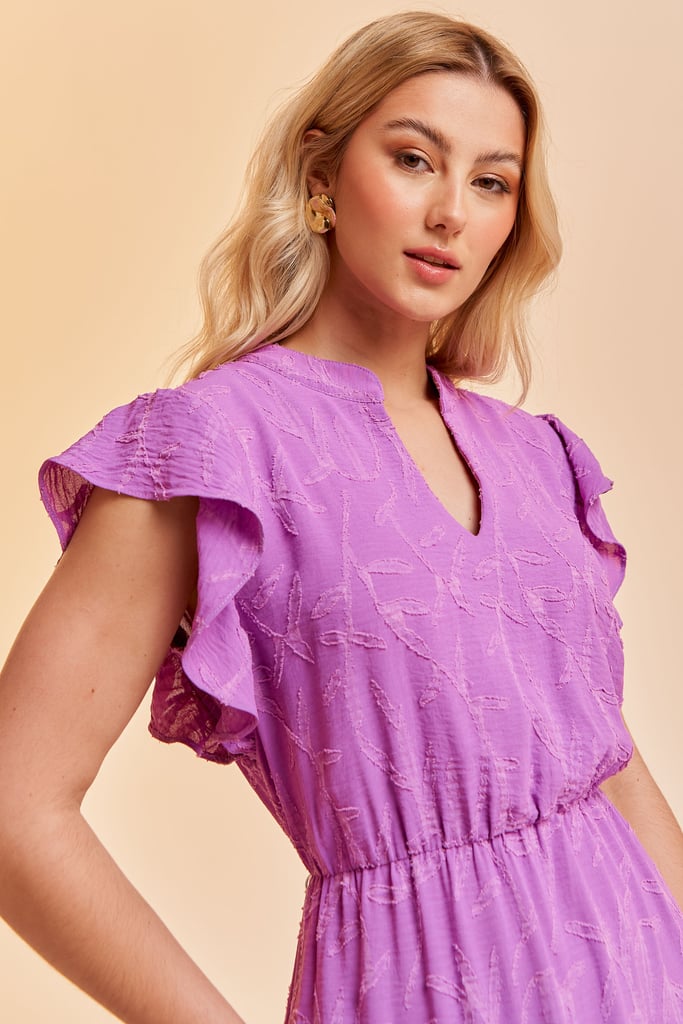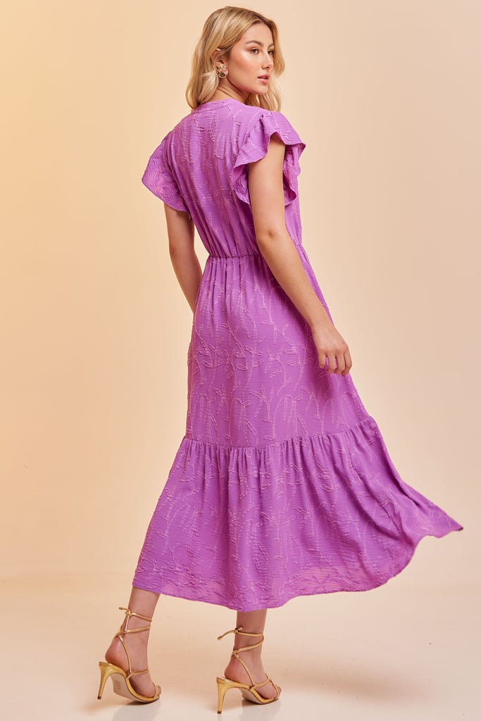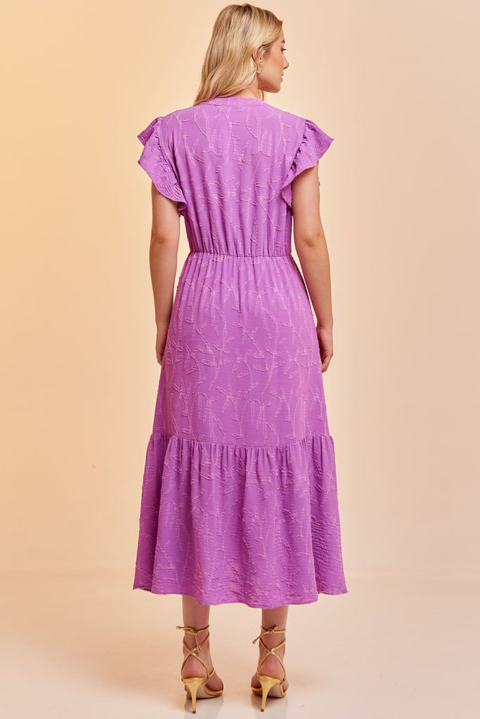 Vestido no comprimento midi confeccionado em crepe texturizado com padronagem de folhagem. Possui gola padre, decote V, manga de babado, elástico interno na cintura para efeito blusê e saia com babado na barra. Acompanha faixa do mesmo tecido para amarração.