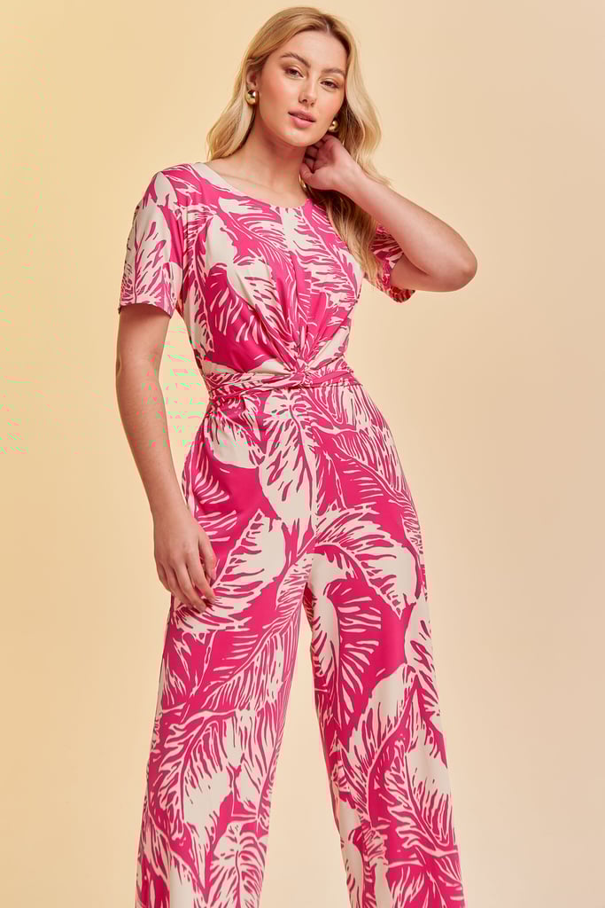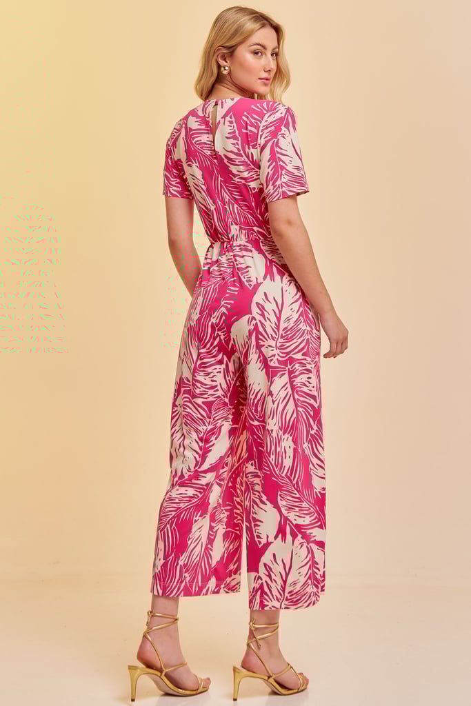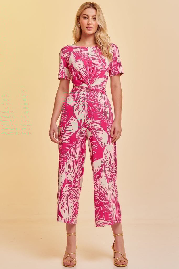 Macacão estilo pantacourt confeccionado em tecido de Fluity com estampa exclusiva. Possui torção frontal que dá todo charme à peça, decote redondo, manga curta, bolsos laterais e fechamento por botão nas costas.