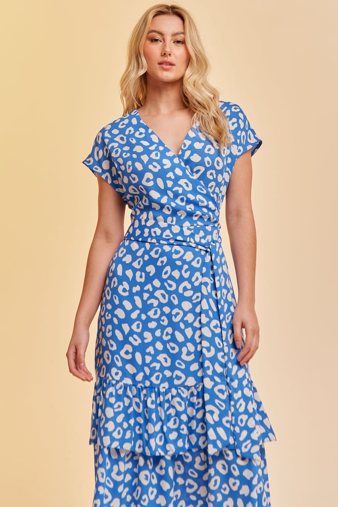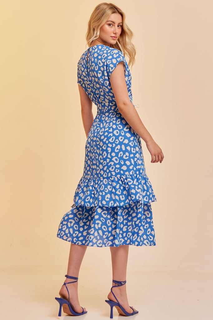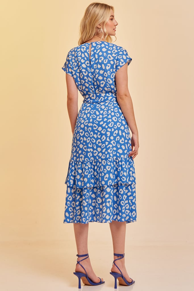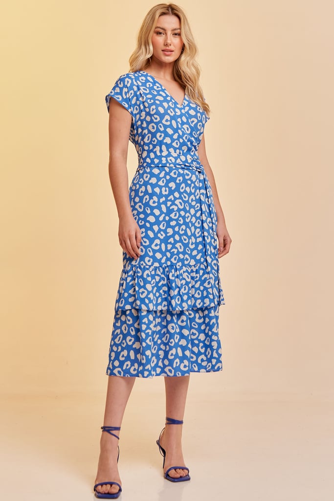Vestido confeccionado em tecido de crepe com padronagem animal print. Possui decote transpassado, manga japonesa e comprimento midi com babado duplo na barra. Fechamento por zíper e botão nas costas. Faixa do mesmo tecido fixada na lateral para amarração. Peça forrada.