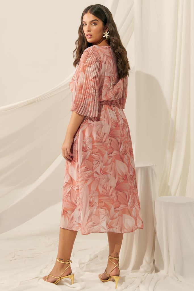 Vestido confeccionado em tecido de chiffon com estamparia exclusiva. Possui decote arredondado e mangas 3/4 tipo sino plissadas. Detalhe de lastex na cintura. Comprimento midi. Peça forrada.