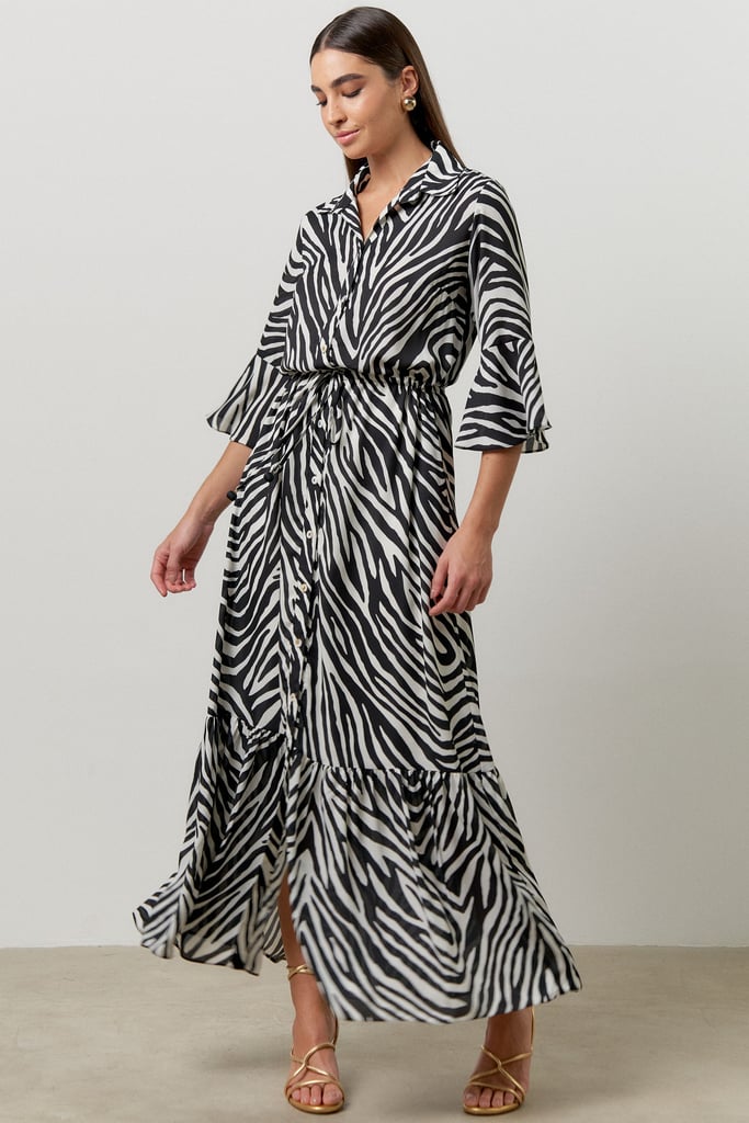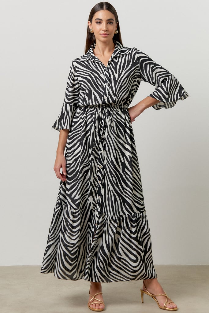 A chemise, confeccionada em crepe com estampa de zebra, possui gola de camisa, vista com botões, manga 3/4 com babado, detalhe de túnel com tira para amarração na cintura para regulagem e babado na barra da chemise. Peça forrada.
