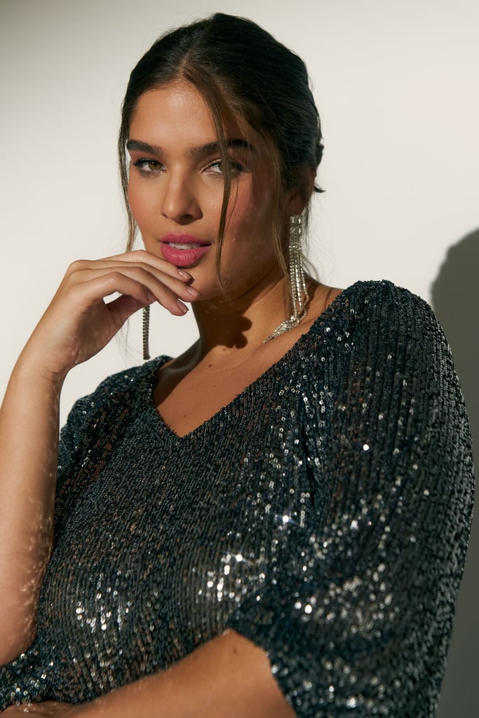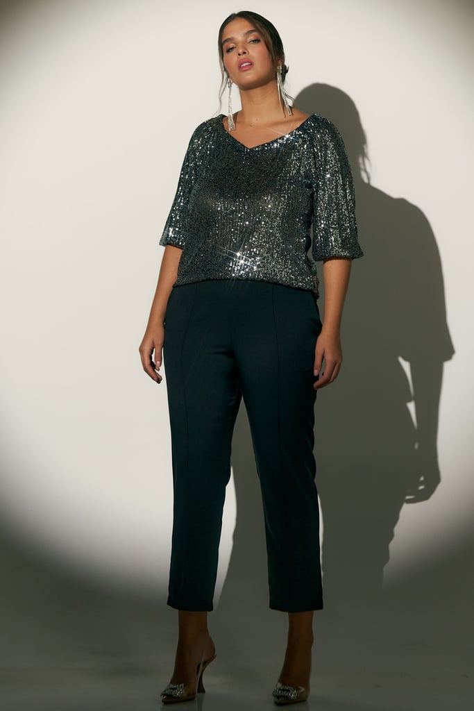 A blusa, confeccionada em paetê, é a peça ideal para ocasiões especiais. Ela possui decote versátil podendo ser usada ombro a ombro e manga raglan 3/4 com elástico na barra.