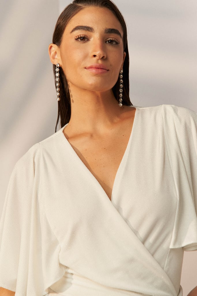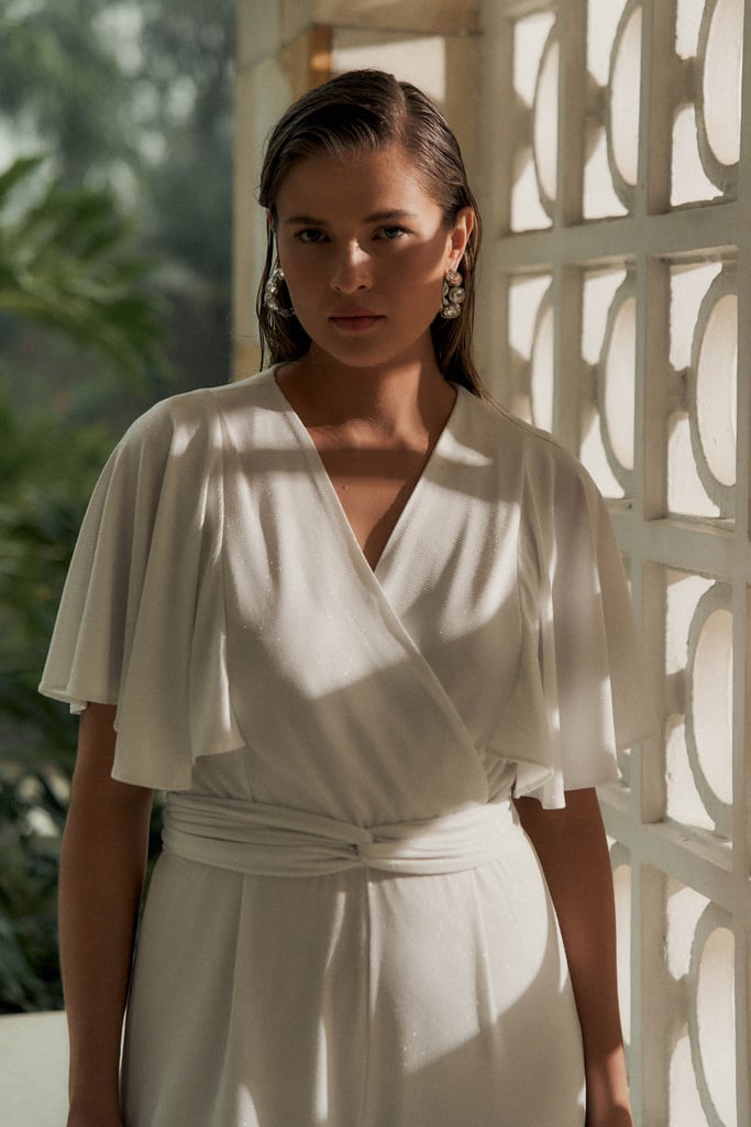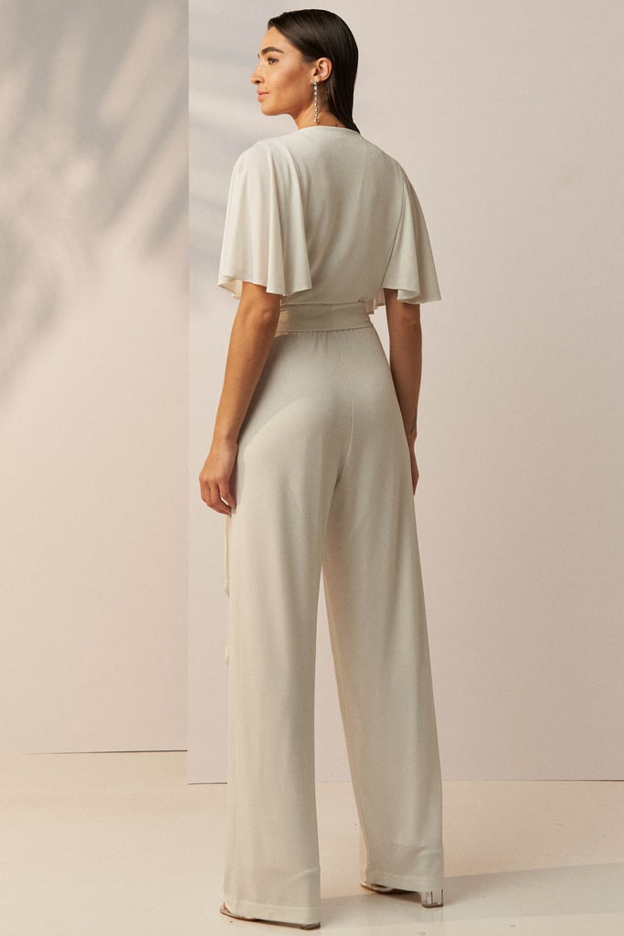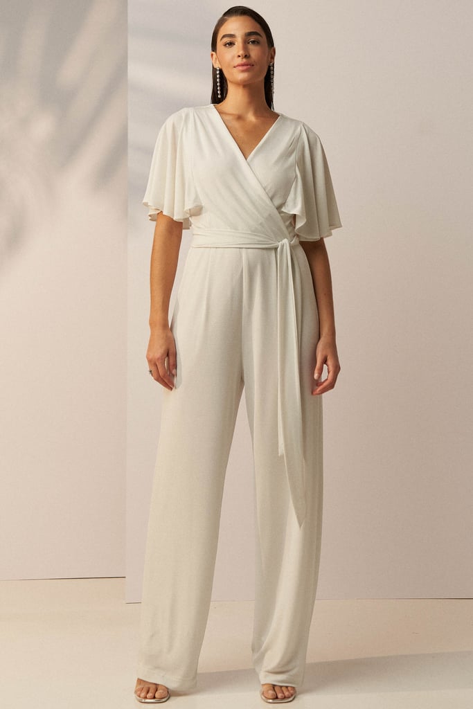 Macacão confeccionado em malha de lurex. Possui decote transpassado, manga godê e elástico interno na cintura para maior conforto. Acompanha faixa do mesmo tecido para amarração. Peça forrada.