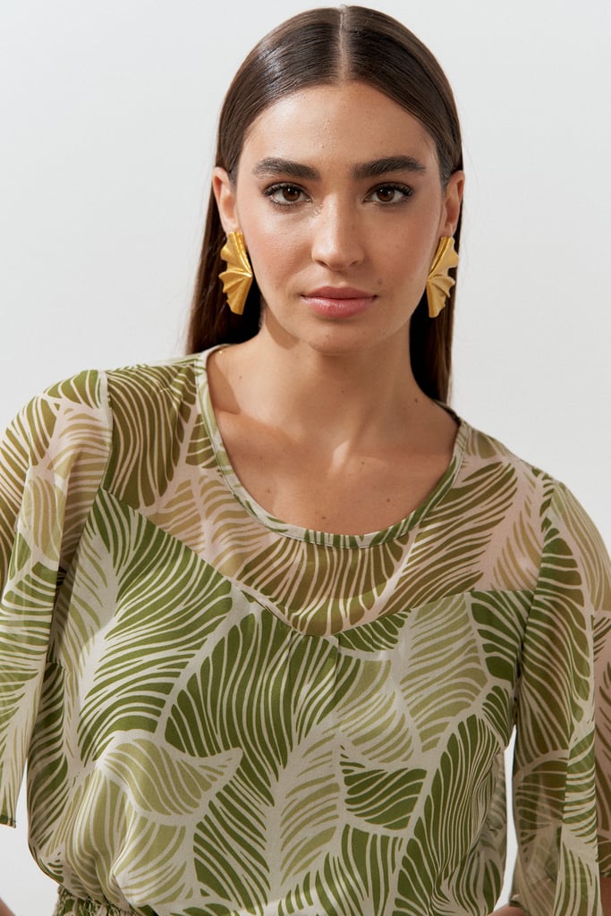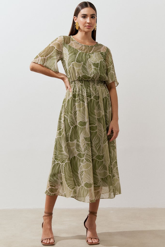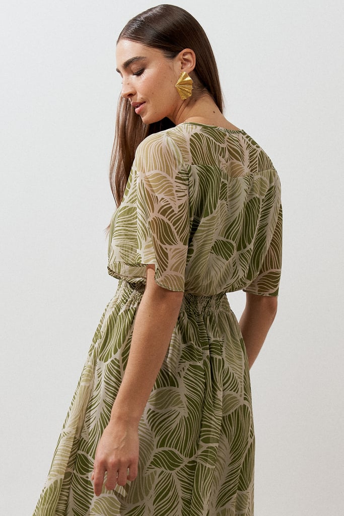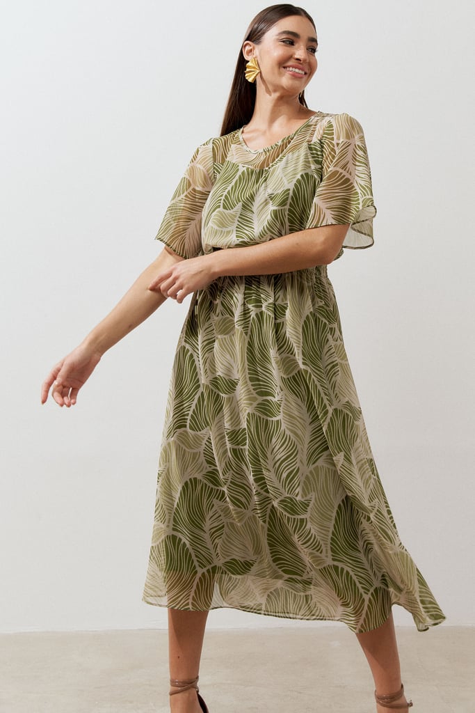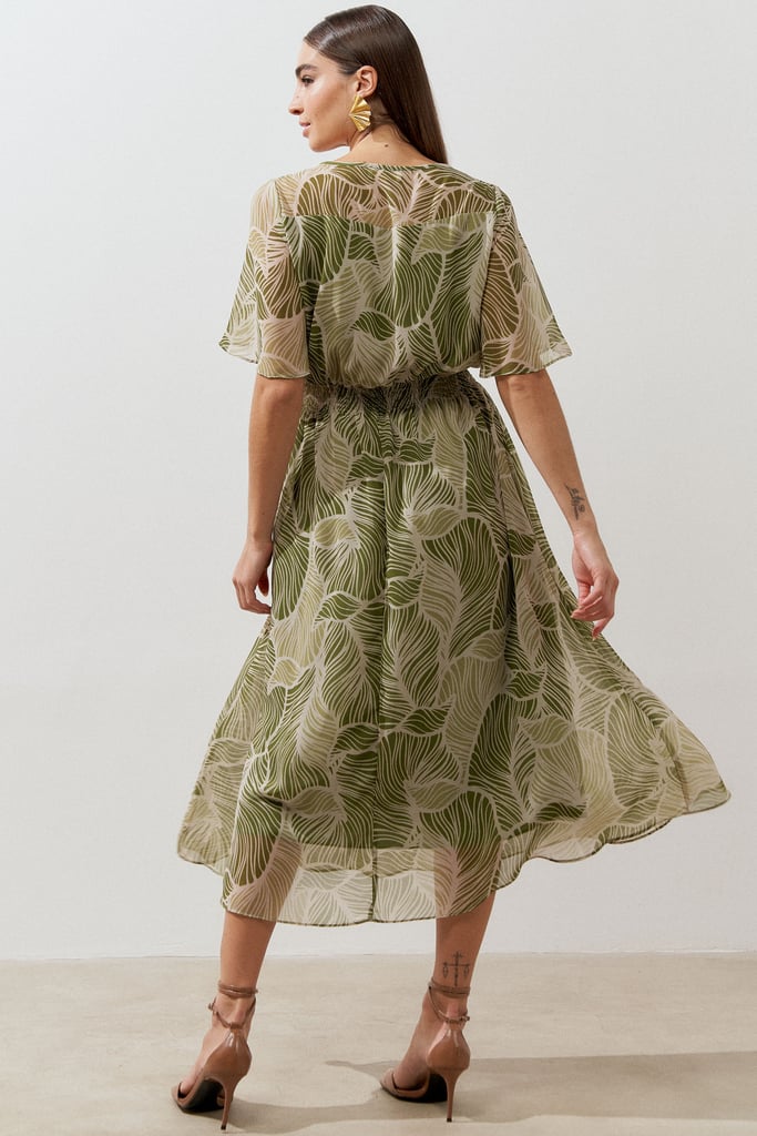 Vestido confeccionado em tecido de chiffon com estampa de folhagem exclusiva. Possui decote redondo com recorte em formato V. Manga curta tipo sino. Detalhe de lastex na cintura. Comprimento midi. Peça forrada.