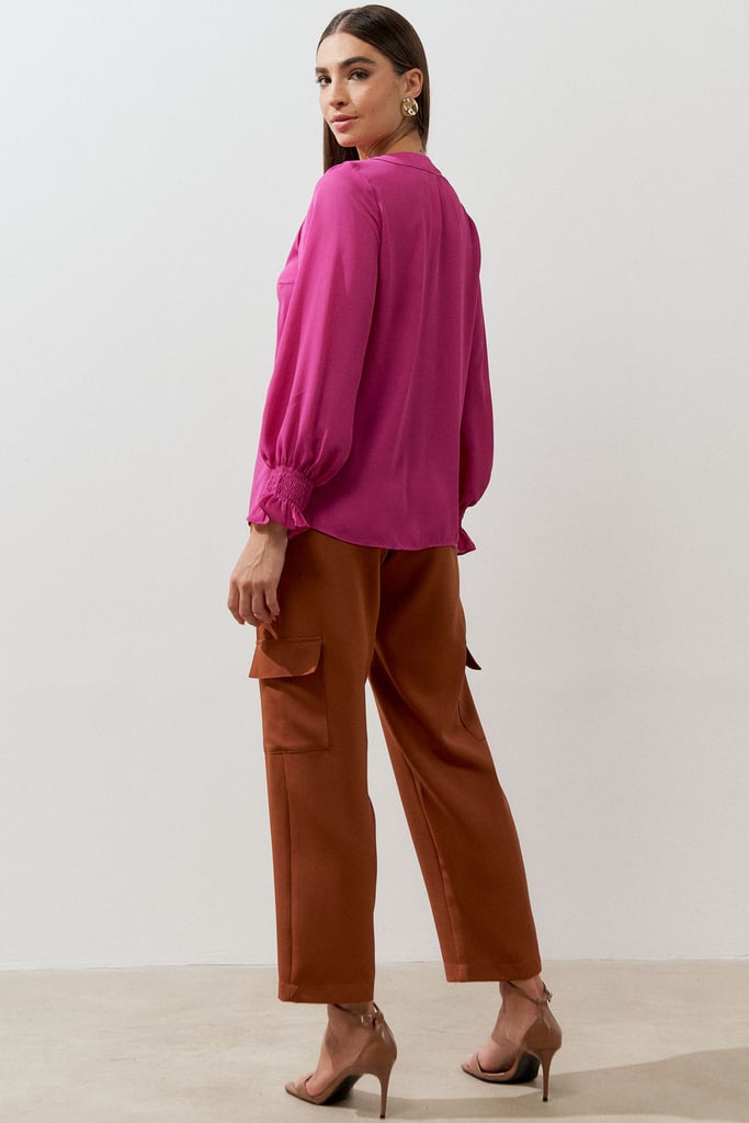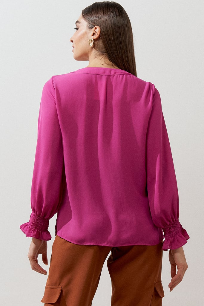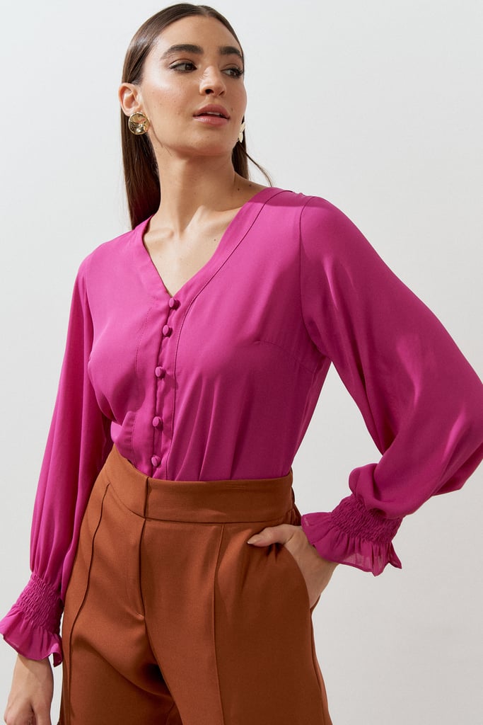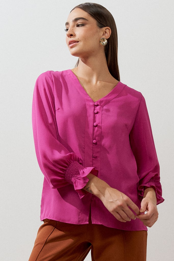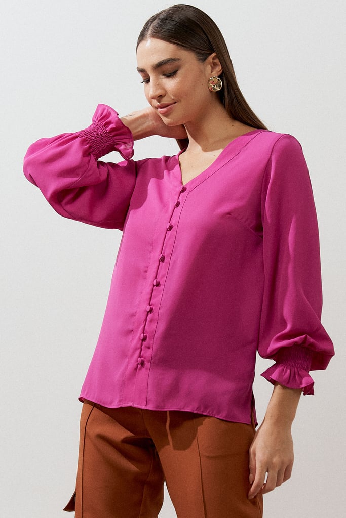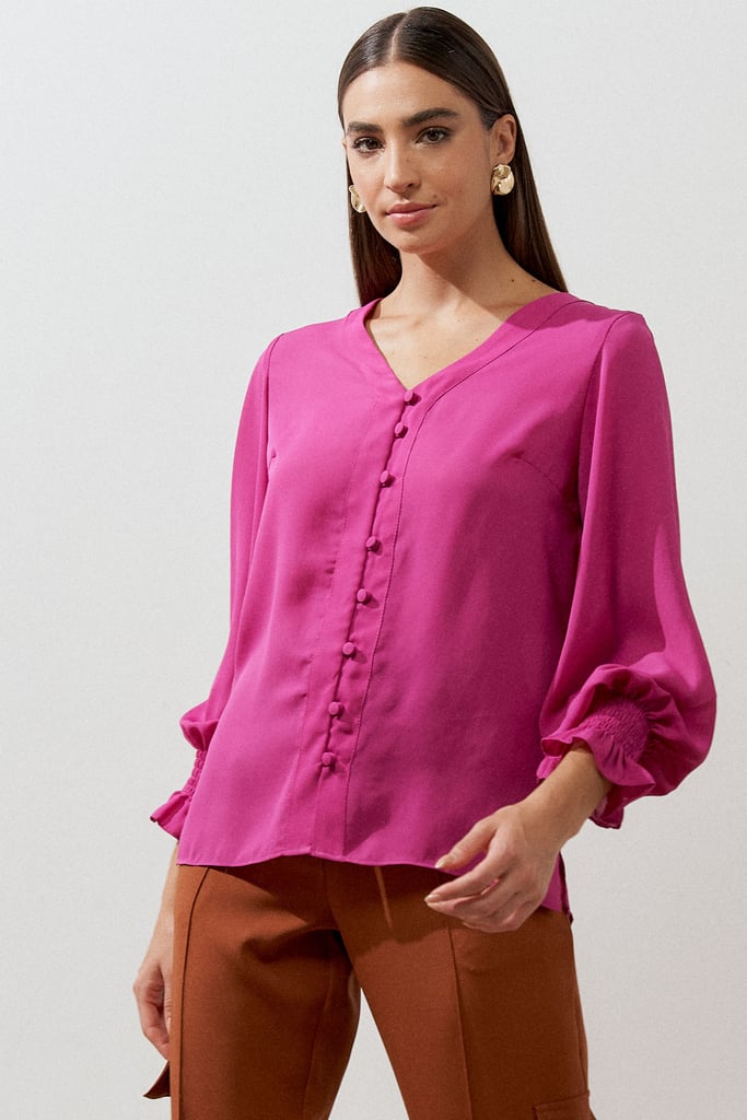 Blusa confeccionada em tecido de crepe liso. Possui decote V e detalhe de vista com abotoamento falso. Manga longa com terminação de lastex.