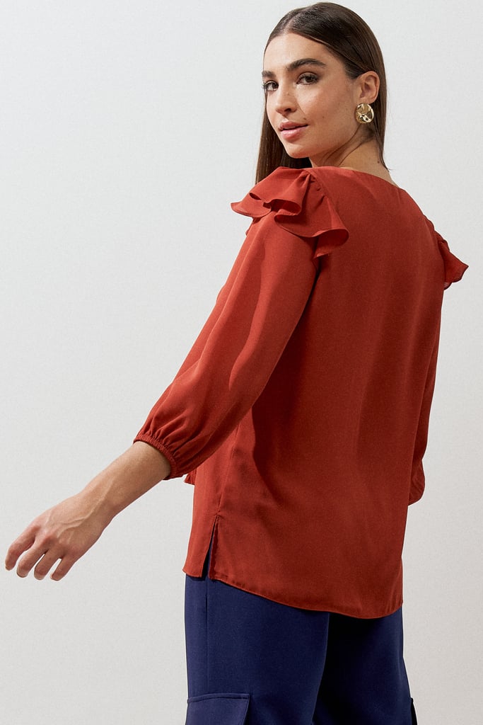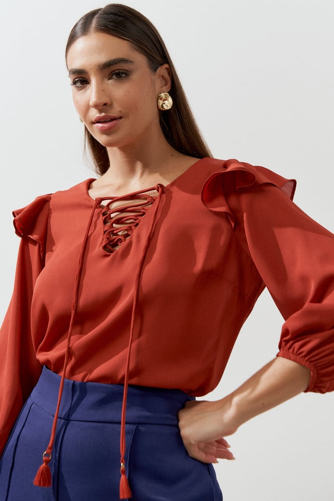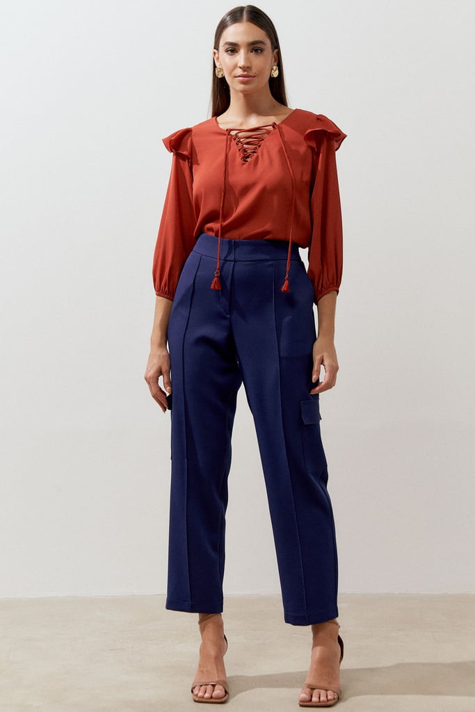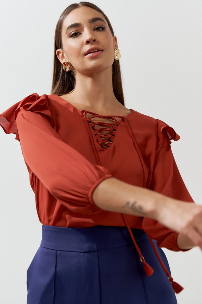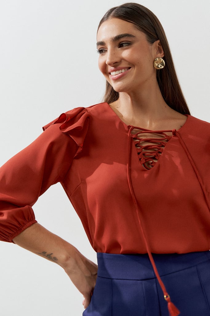 Blusa confeccionada em tecido de crepe liso. Possui decote com passantes e tiras para amarração. Manga 3/4 com terminação de elástico e detalhe de babado no ombro que dá todo charme à peça.