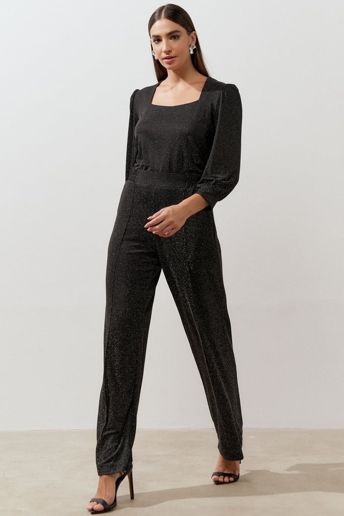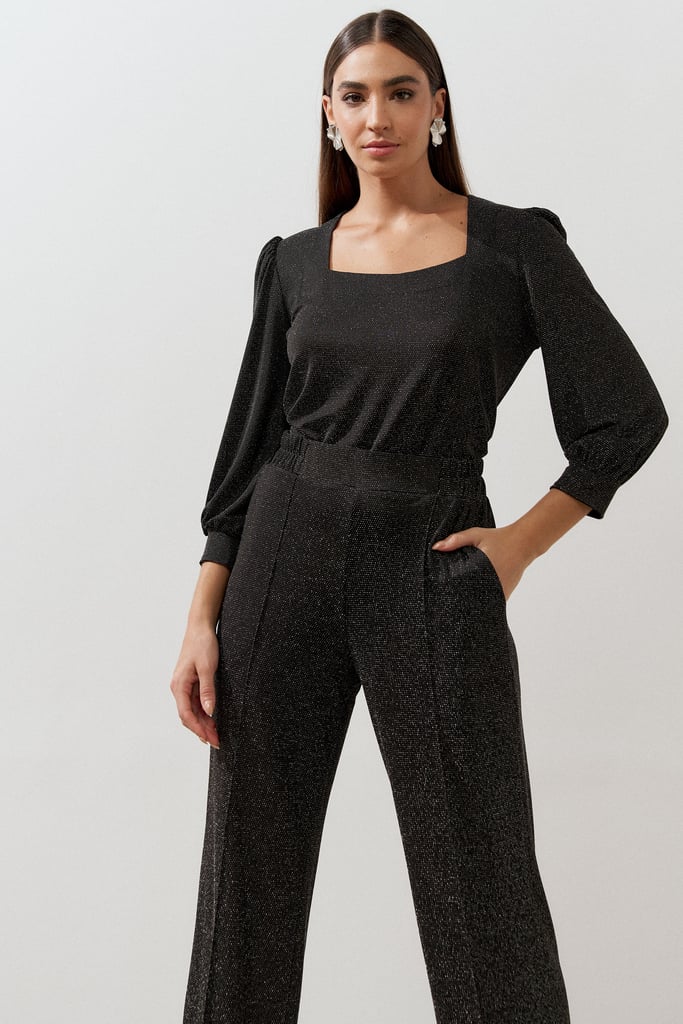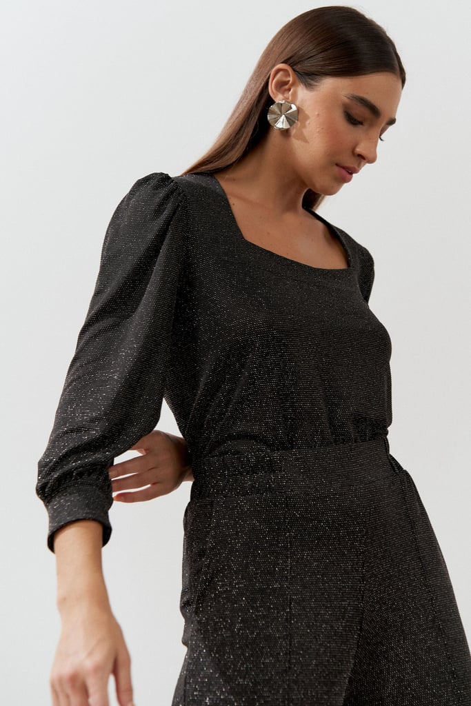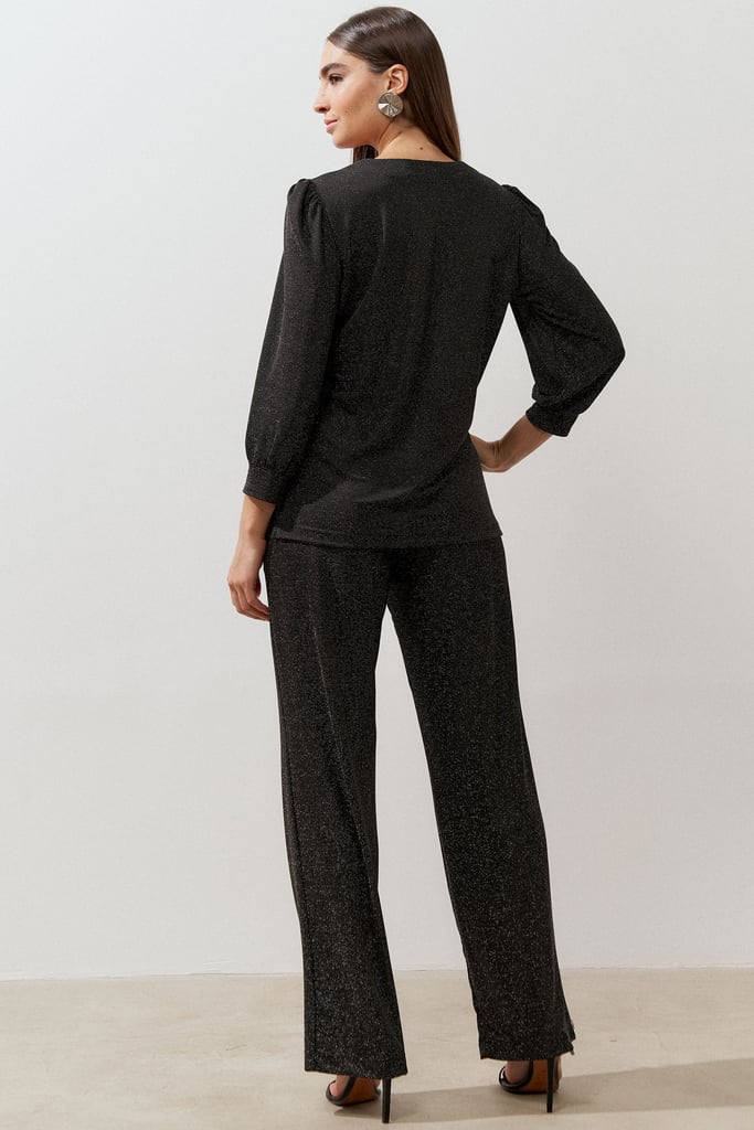 Conjunto confeccionado em tecido de malha de lurex. Blusa possui decote quadrado, manga 3/4 e leve franzido no ombro. Calça traz nossa modelagem clássica reta com nervura frontal, bolsos laterais e cós com elástico nas costas para maior conforto.