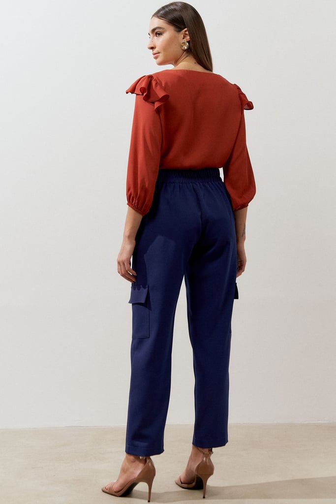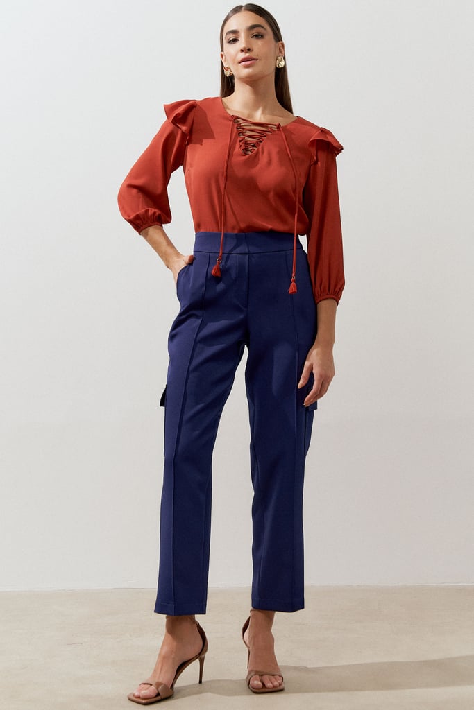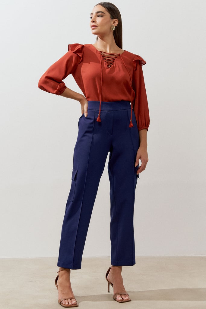 Calça confeccionada em tecido de crepe encorpado com elastano. Ela traz nossa modelagem clássica reta com nervura frontal e braguilha falsa. Detalhe de bolsos laterais tipo faca e cargo. Cós com elástico nas costas para maior conforto.