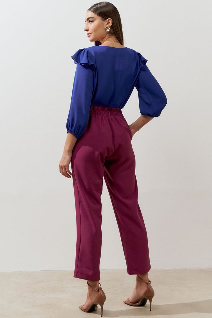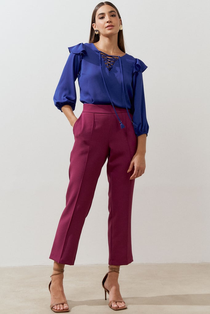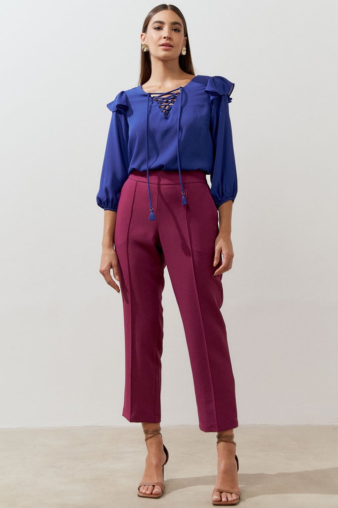 Calça confeccionada em tecido de crepe encorpado com elastano. Ela traz nossa modelagem clássica reta com nervura frontal, bolsos lateraise cós com elástico nas costas para maior conforto.