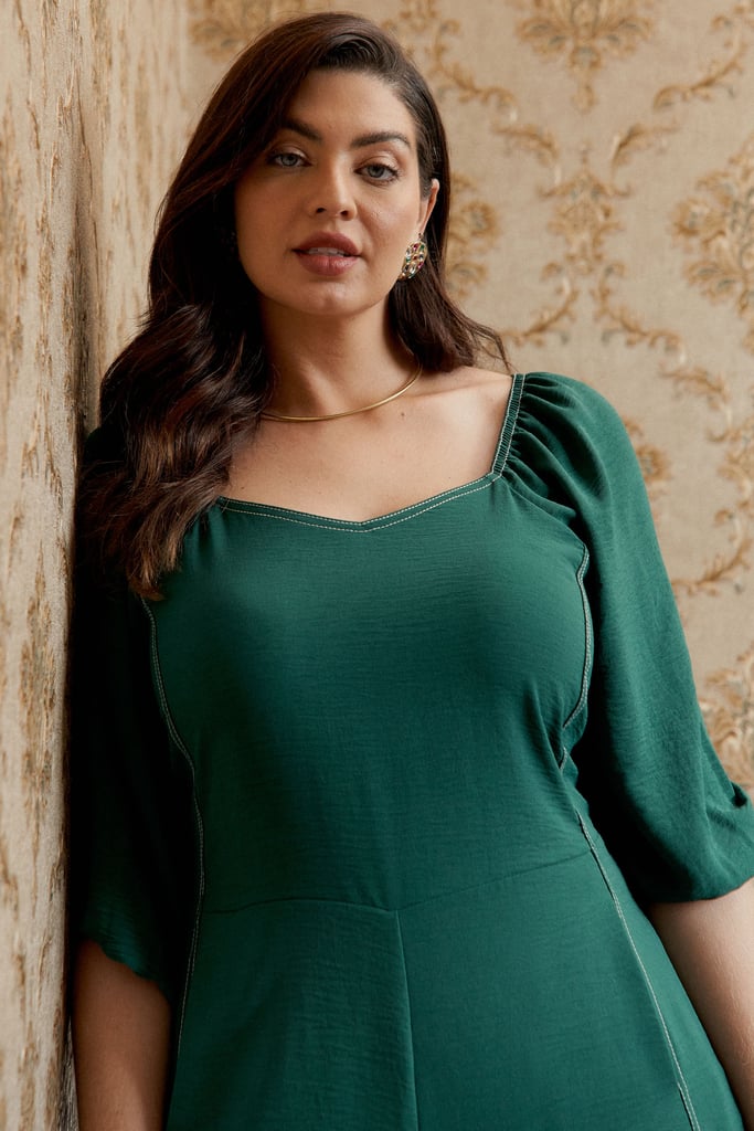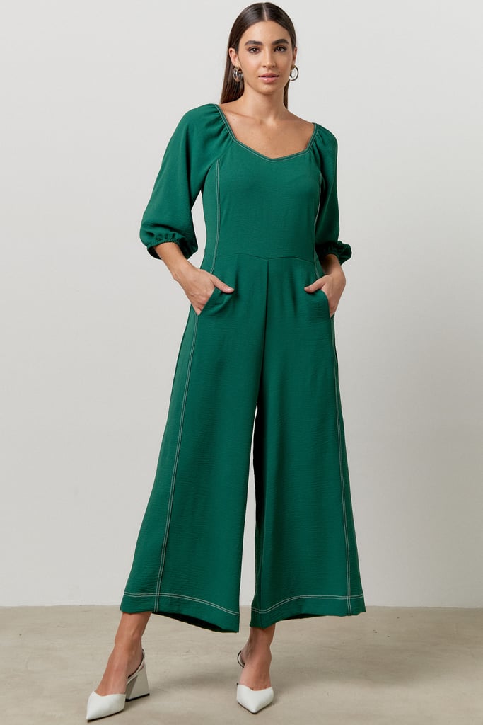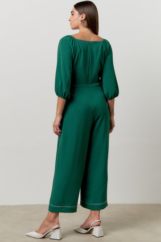 Macacão pantacourt confeccionado em tecido de crepe com aspecto enrugado. Possui decote princesa, bolsos frontais e manga bufante 3/4 com terminação de elástico. Detalhe de pesponto por toda a peça. Fechamento por zíper invisível nas costas.