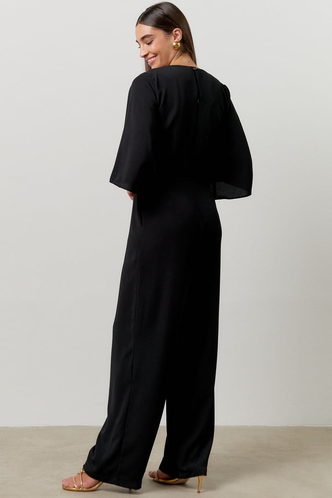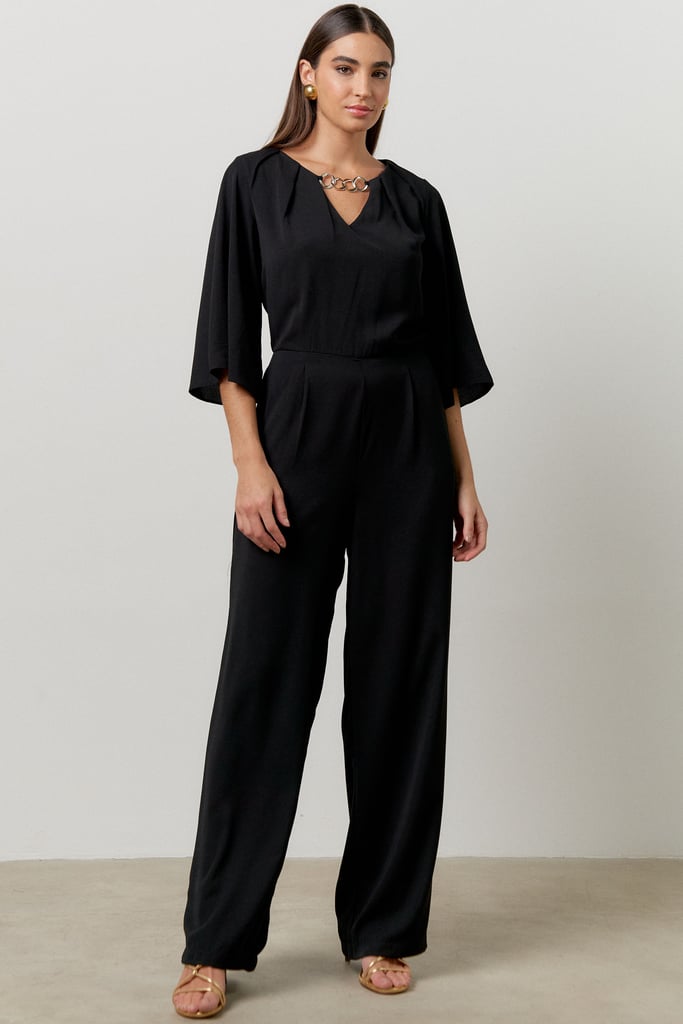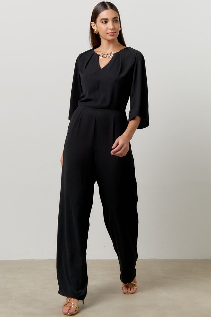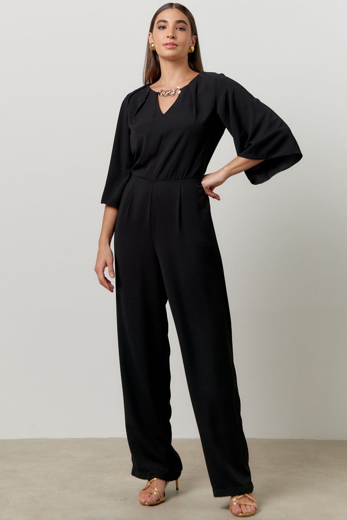 O macacão é a escolha perfeita para mulheres que buscam estilo e praticidade em uma única peça. Confeccionado em tecido de crepe, ele possui decote arredondado com detalhe de pregas e corrente dourada que dão todo charme à peça. Possui também manga 3/4 tipo sino, pregas frontais e bolsos laterais. Fechamento zíper e botão nas costas.