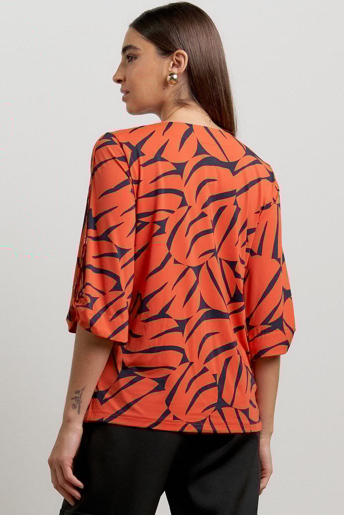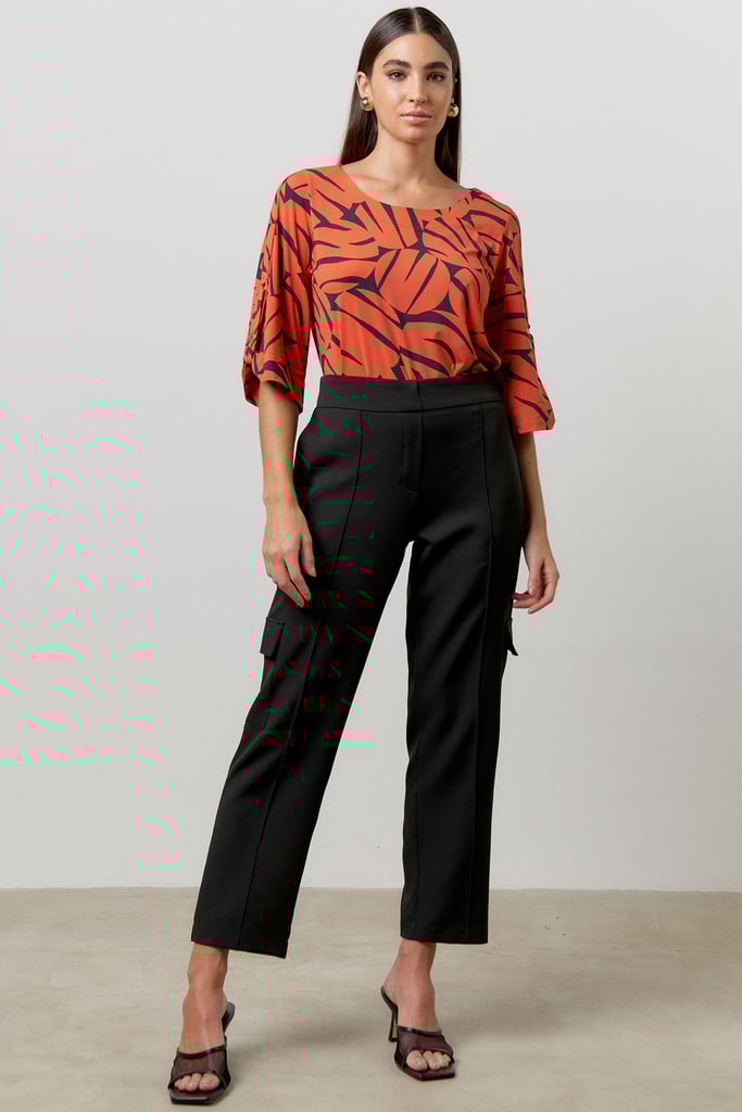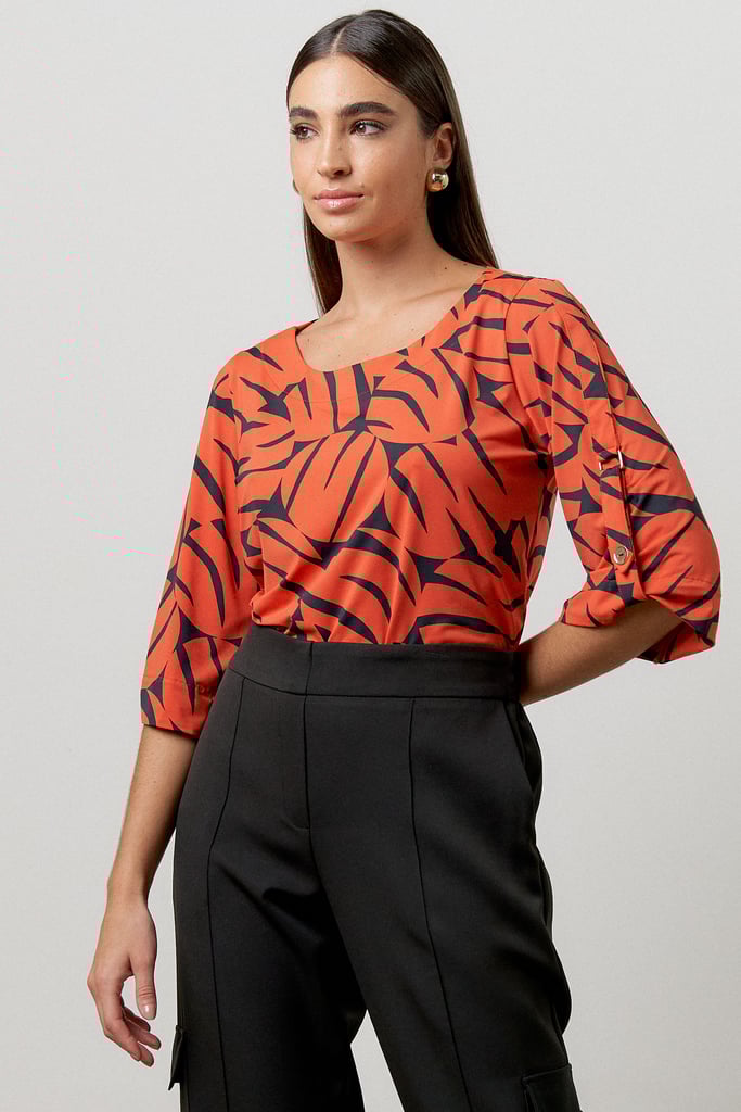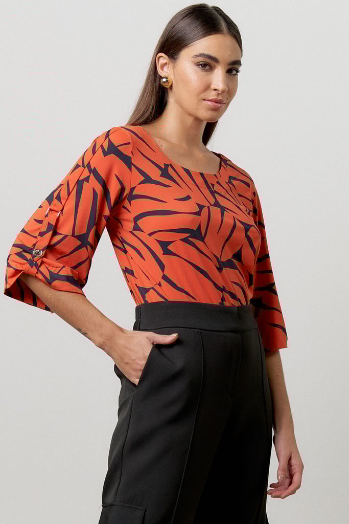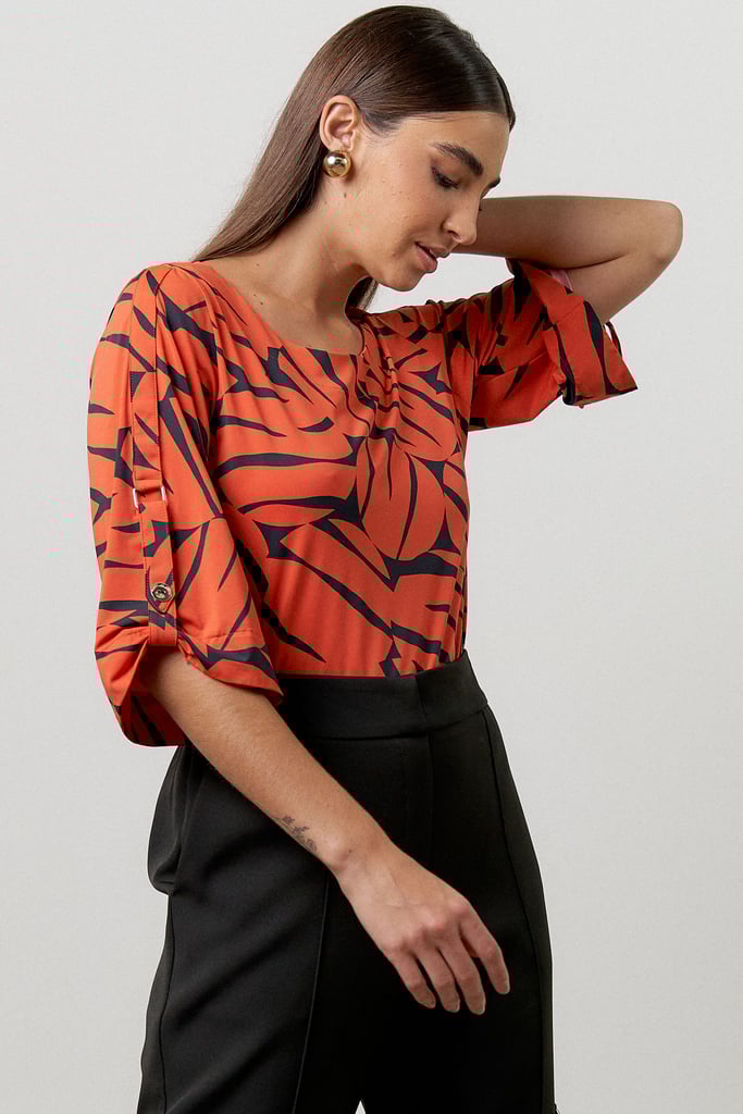 Blusa confeccionada em tecido de Fluity com estampa exclusiva. Possui decote careca, manga ampla 3/4 com detalhe de martingale e botão dourado decorativo.