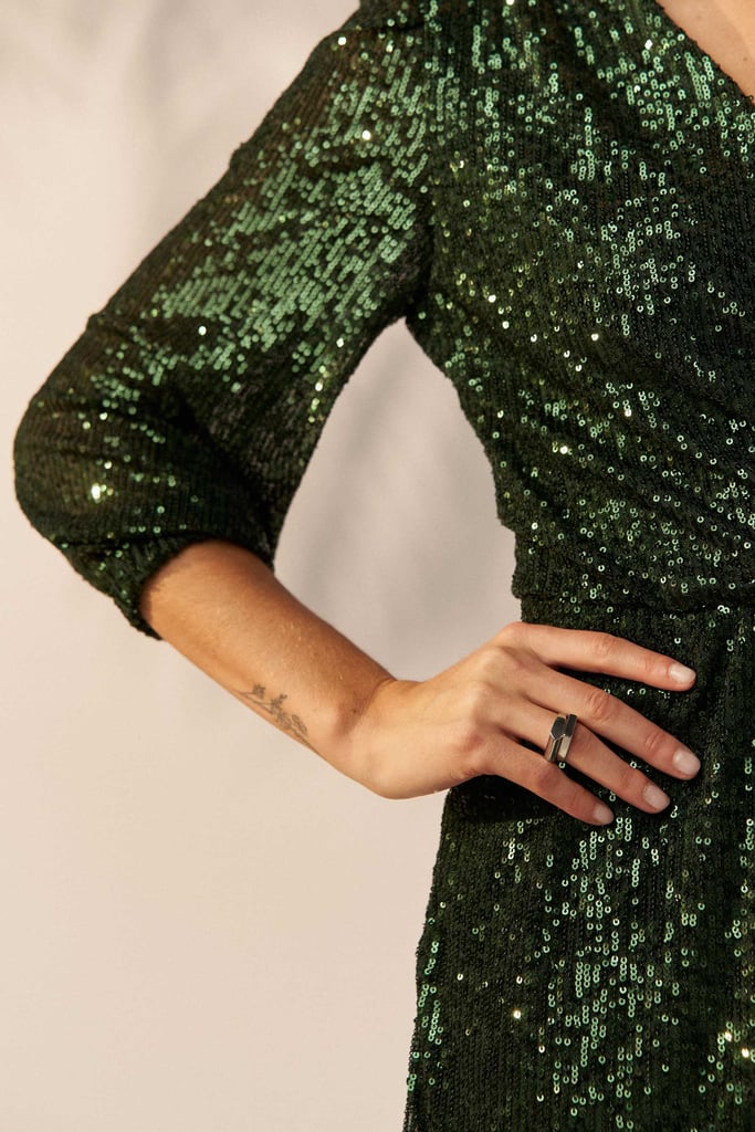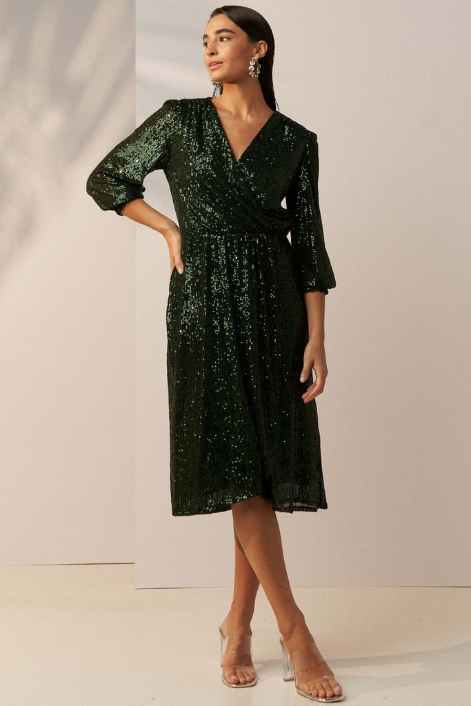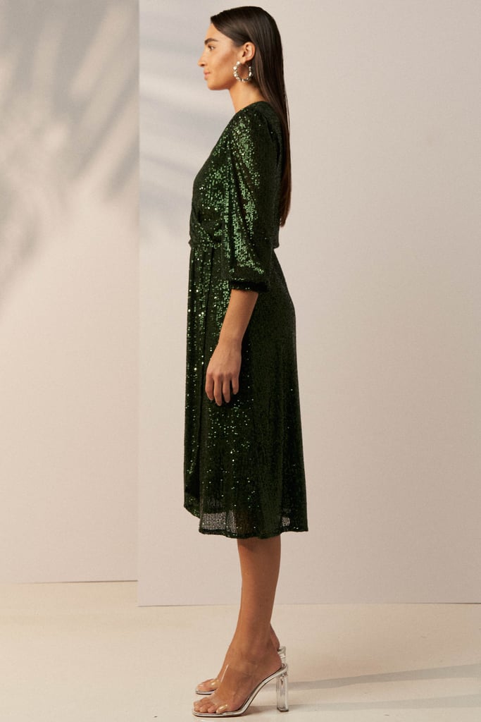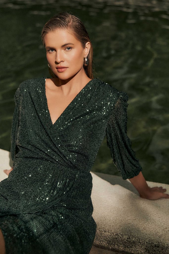 Vestido transpassado feito em paetê com recorte na cintura e manga 3/4 com elástico no punho. Comprimento midi. Peça forrada. O modelo é ideal para ocasiões mais arrumadas, pois traz sofisticação.