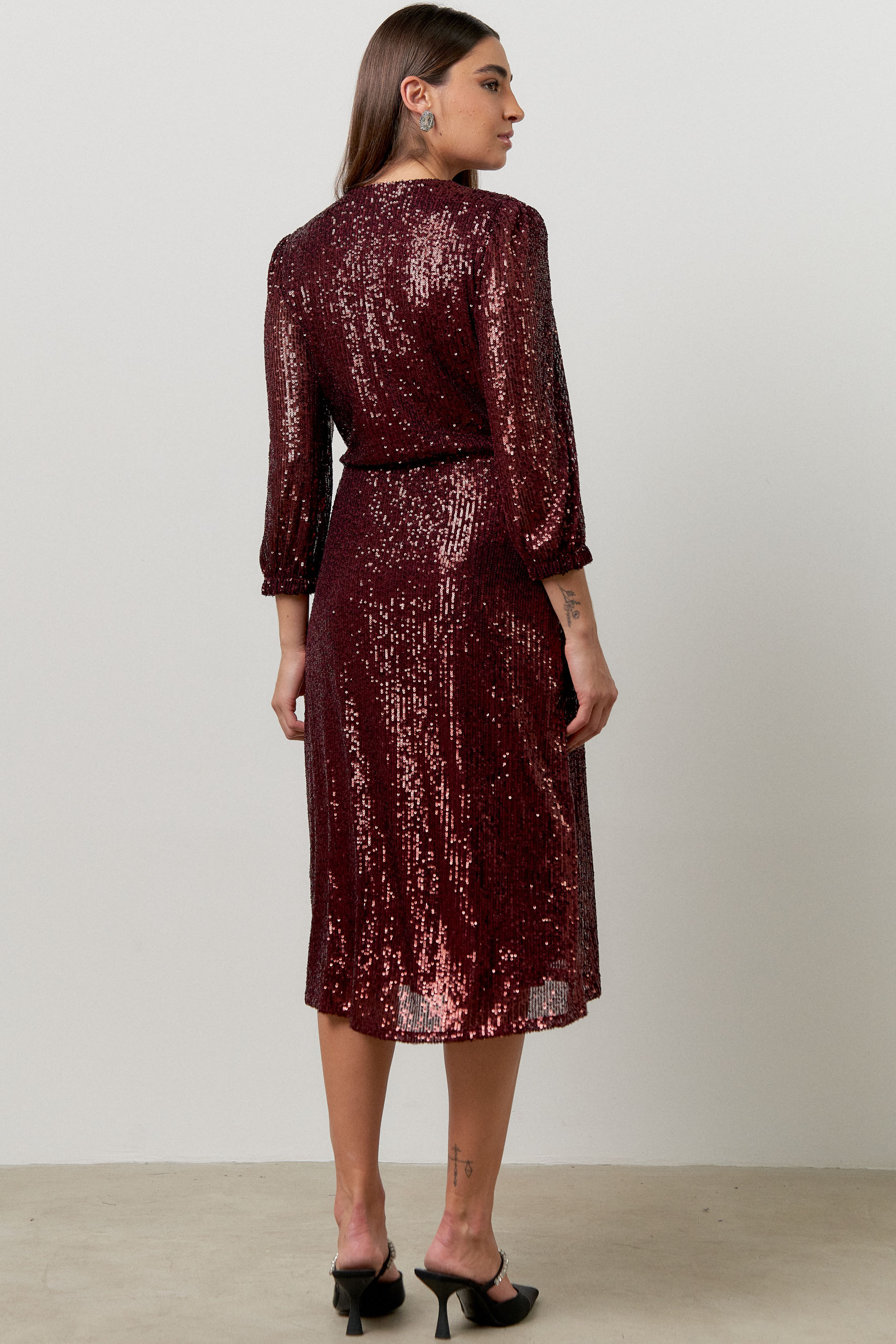 Vestido transpassado feito em paetê com recorte na cintura e manga 3/4 com elástico no punho. Comprimento midi. Peça forrada. O modelo é ideal para ocasiões mais arrumadas, pois traz sofisticação.