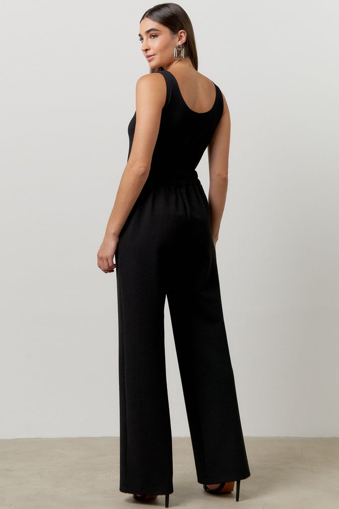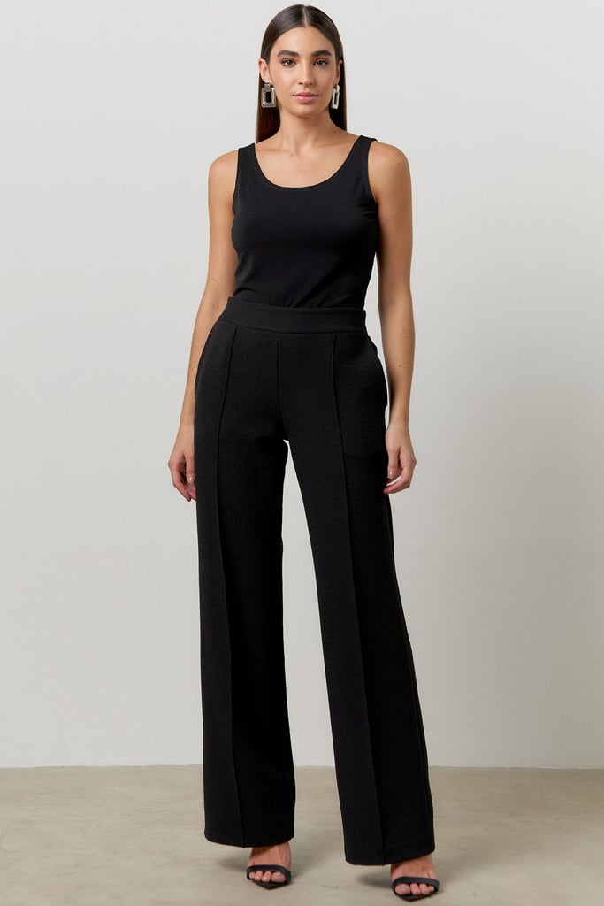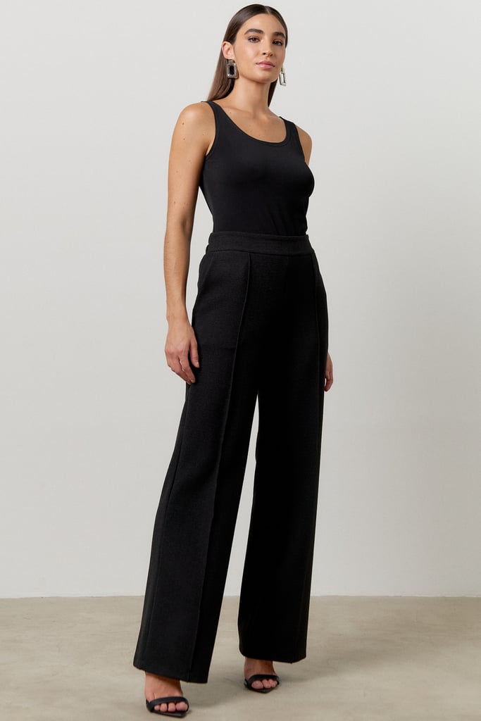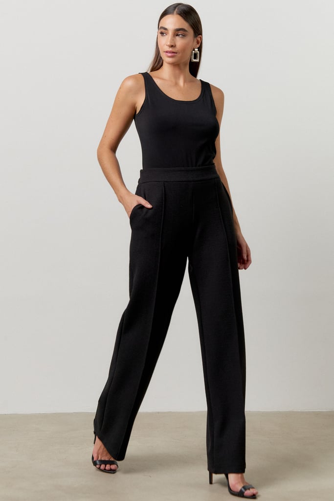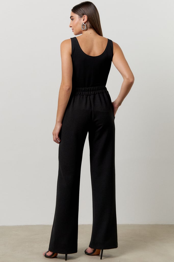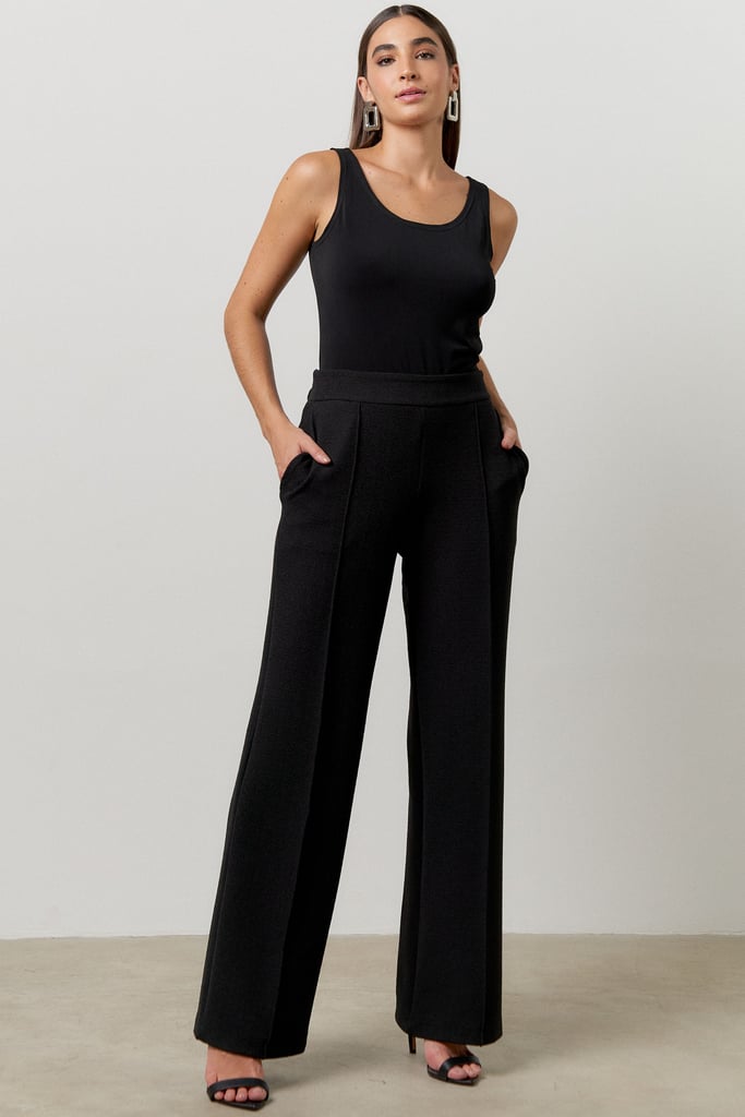 Calça confeccionada em malha de tweed. Ela possui modelagem reta e shape solto ao corpo com detalhe de nervura frontal que dá todo charme à peça. O modelo possui bolsos laterais e cós com elástico embutido nas costas para maior conforto.