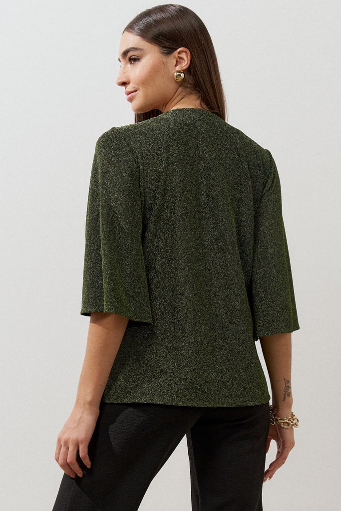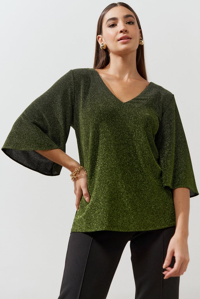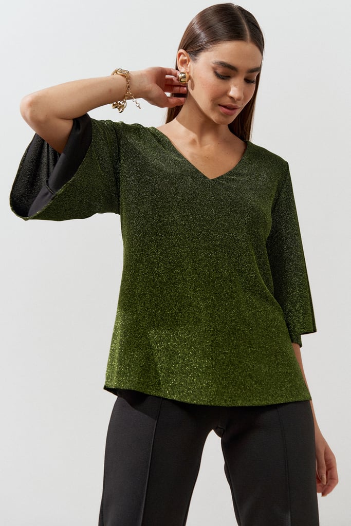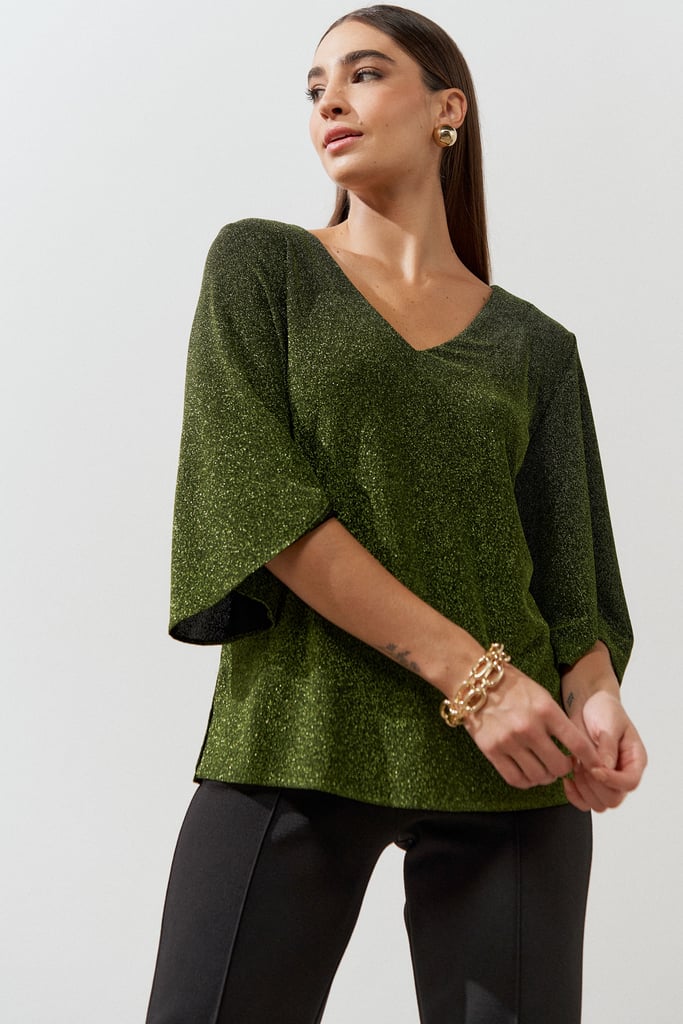 Blusa confeccionada em malha de lurex. Possui decote V e manga 3/4 tipo sino.