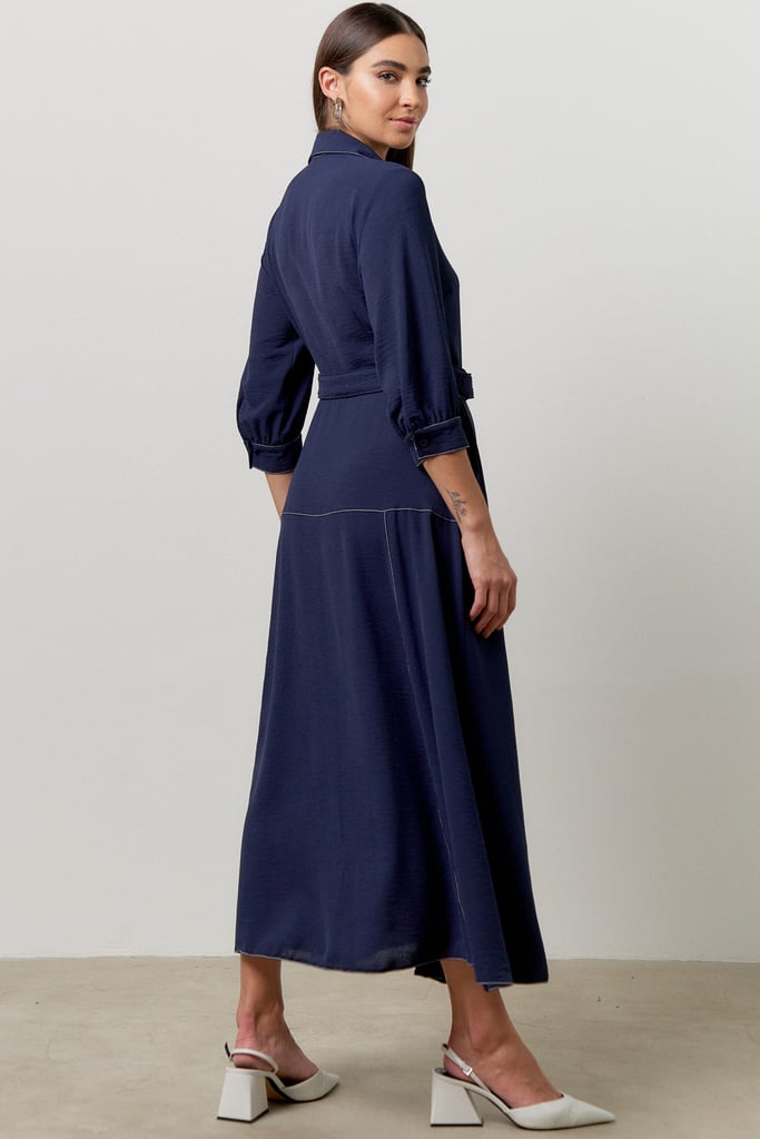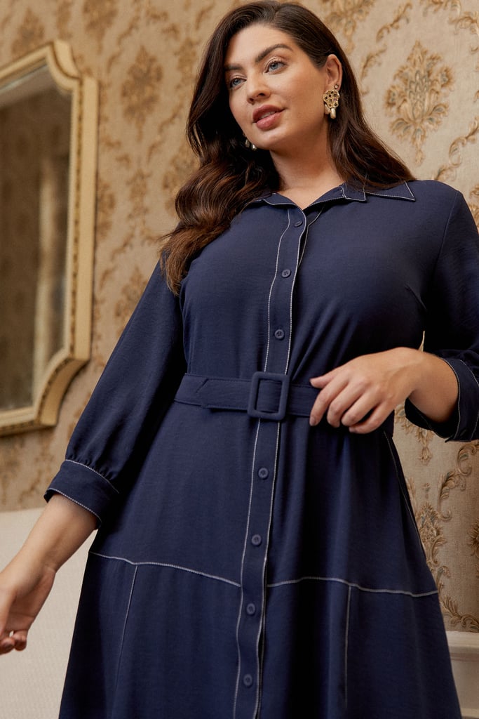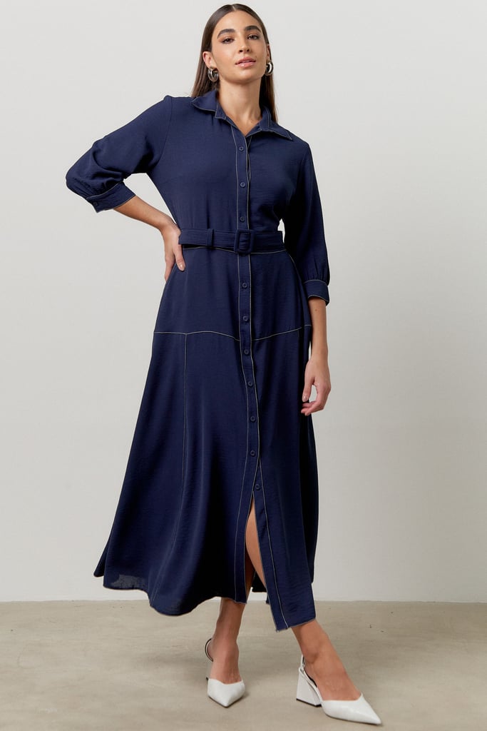 A chemise midi pespontada é uma peça clássica e elegante. Confeccionada em tecido de crepe, ela possui gola de camisa, vista com fechamento frontal por botões e manga 3/4 com punho. Acompanha cinto forrado do mesmo tecido.