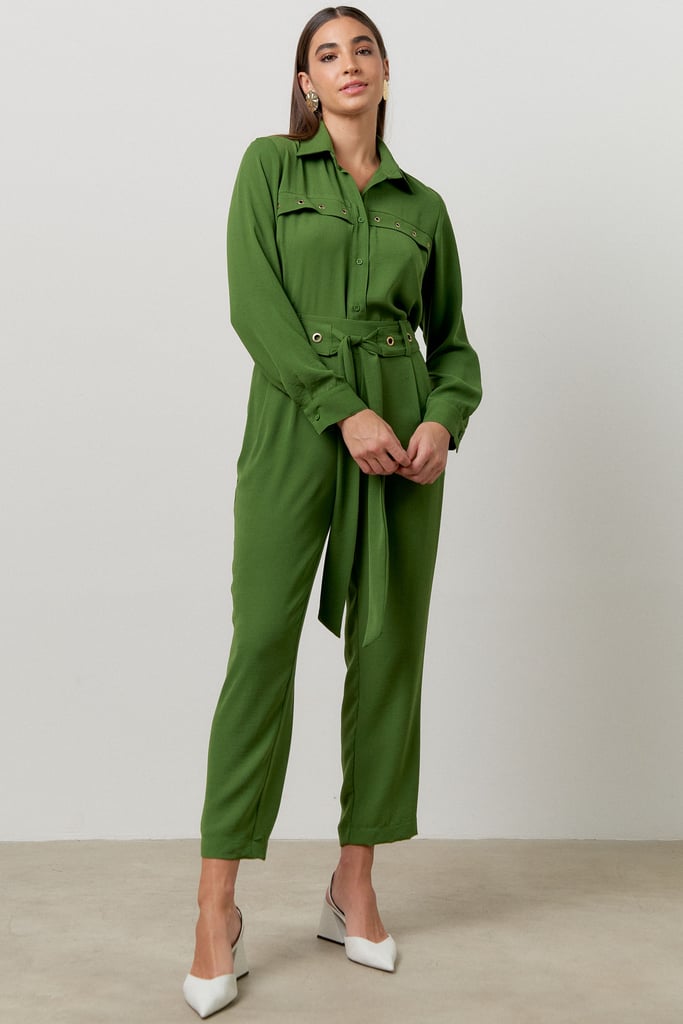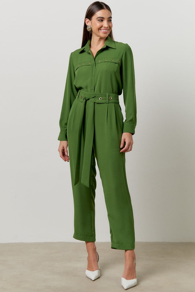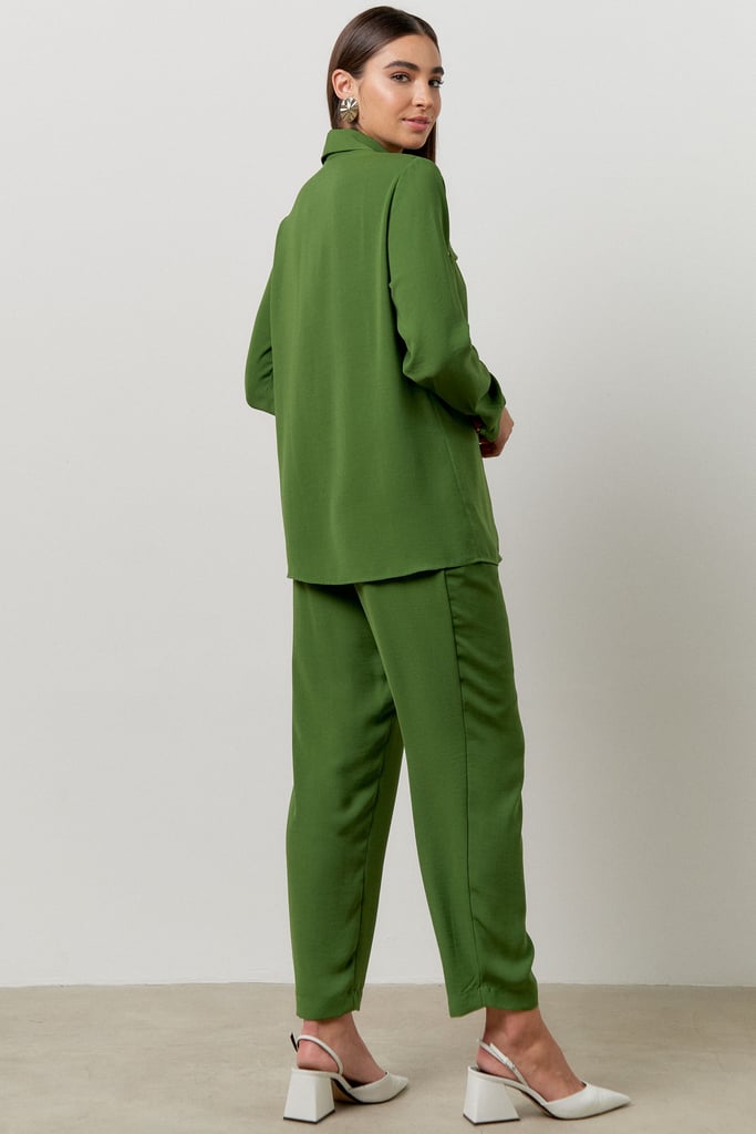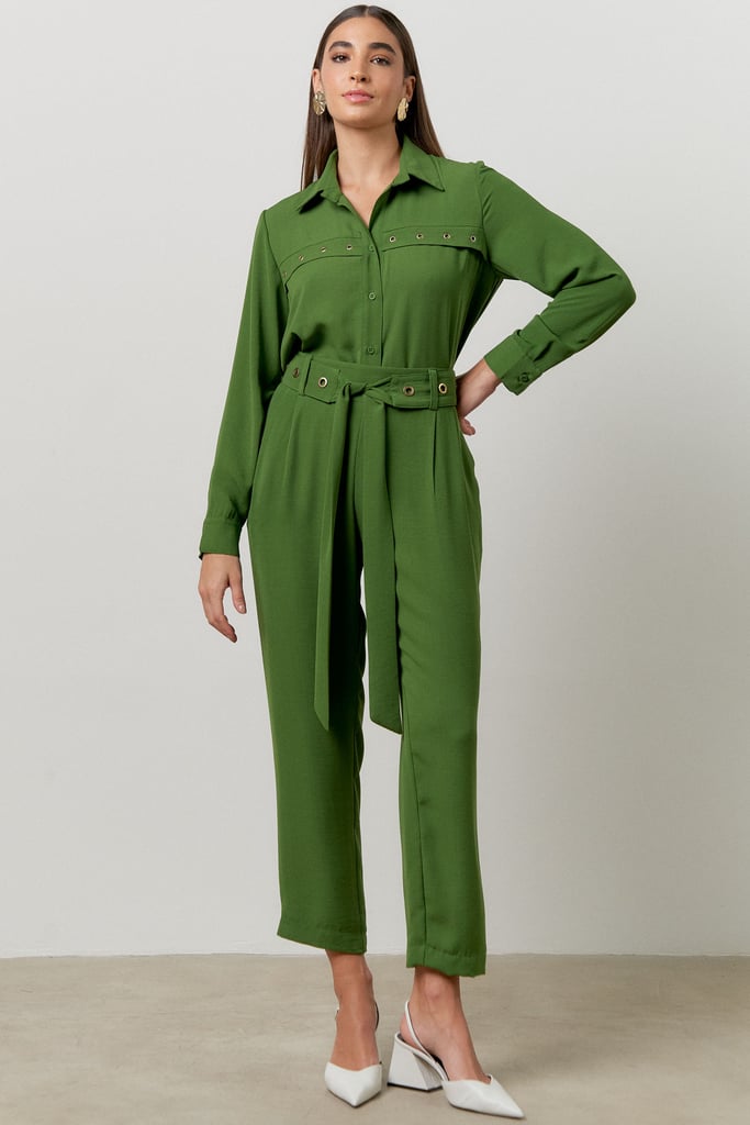O conjunto é a escolha perfeita para mulheres que buscam um visual elegante e versátil - as peças podem ser desmembradas e usadas separadamente. Confeccionado em tecido de crepe, sua modelagem valoriza o corpo feminino sem comprometer o conforto. A camisa possui colarinho francês com fechamento frontal por botões e manga comprida com detalhe de punho ajustado. A calça traz nossa modelagem clássica reta com passantes no cós frontal, faixa fixada nas laterais para amarração, pregas frontais, bolsos laterais e cós com elástico embutido nas costas que possibilita melhor vestibilidade da peça. O charme fica por conta dos ilhoses dourados aplicados por toda peça.