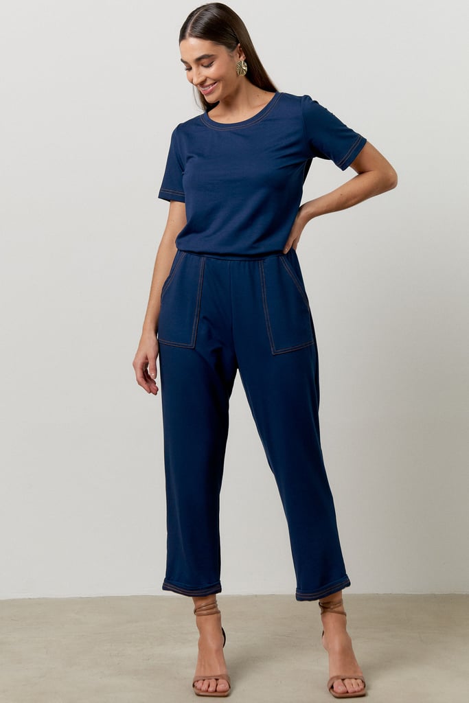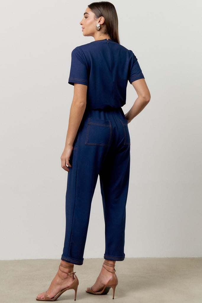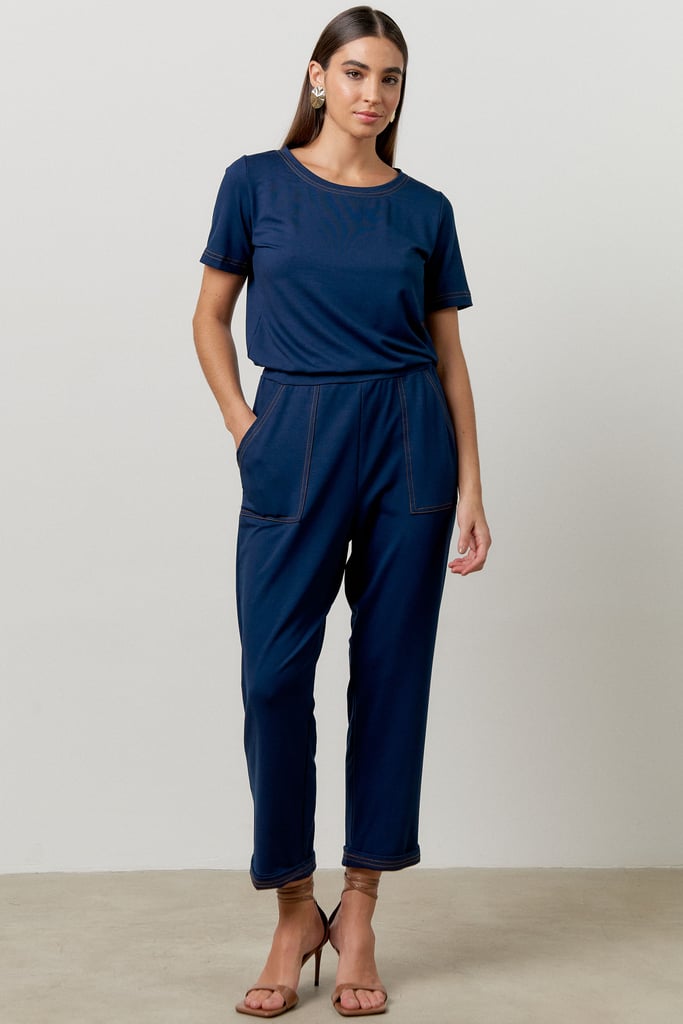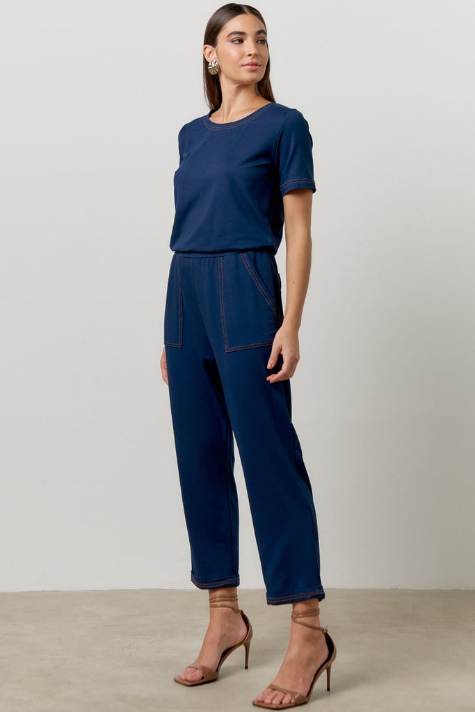 O macacão de malha de viscose é a peça ideal para quem procura um look comfy-chic. Ele possui decote arredondado, manga curta, pala na cintura com elástico para melhor vestibilidade da peça e bolsos estilo cargo. Fechamento por zíper nas costas. O charme fica por conta do trabalho de pesponto contrastante por toda a peça.