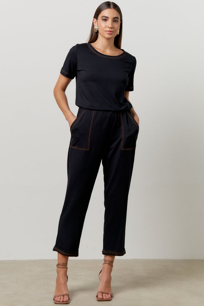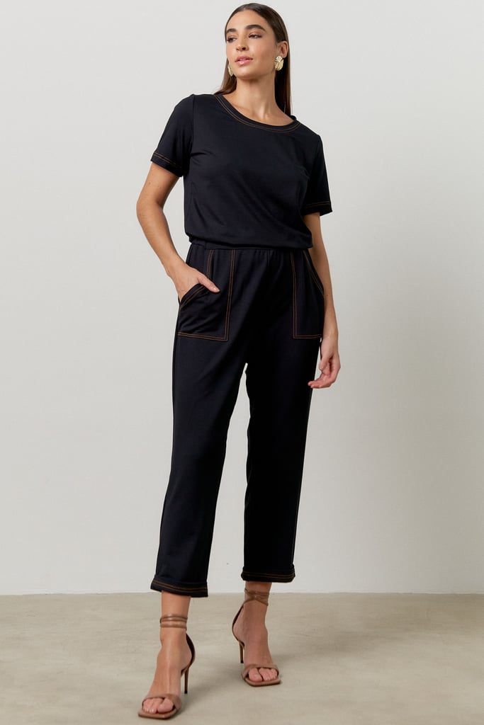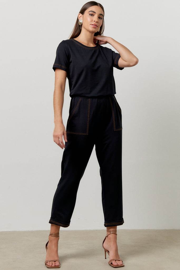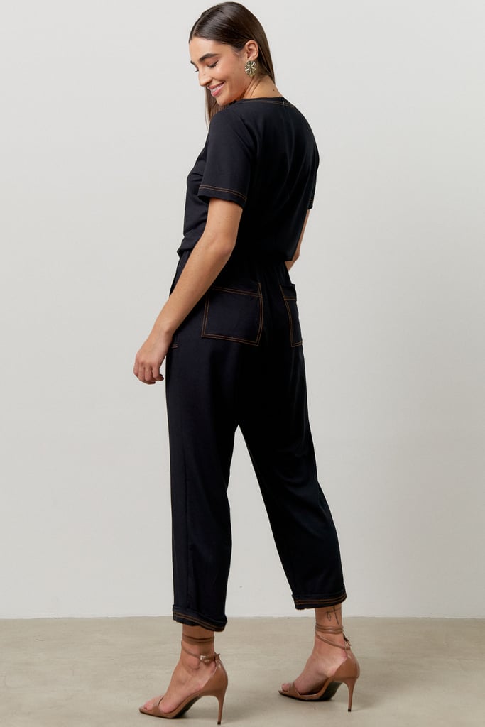 O macacão de malha de viscose é a peça ideal para quem procura um look comfy-chic. Ele possui decote arredondado, manga curta, pala na cintura com elástico para melhor vestibilidade da peça e bolsos estilo cargo. Fechamento por zíper nas costas. O charme fica por conta do trabalho de pesponto contrastante por toda a peça.