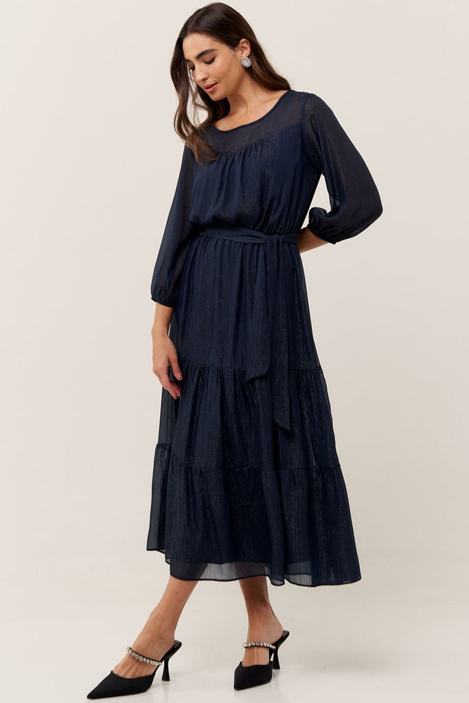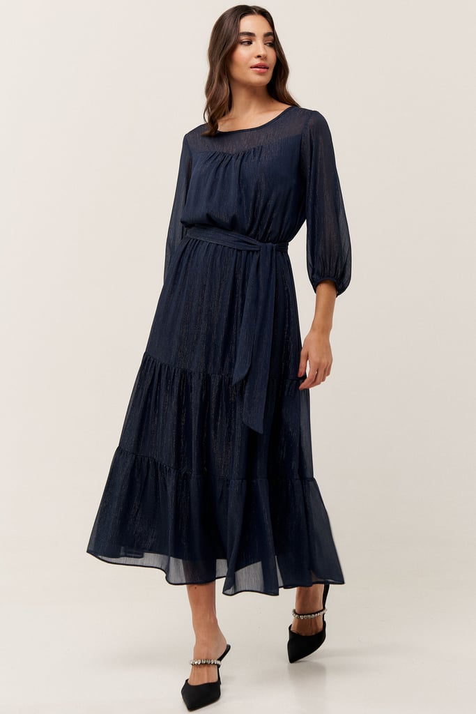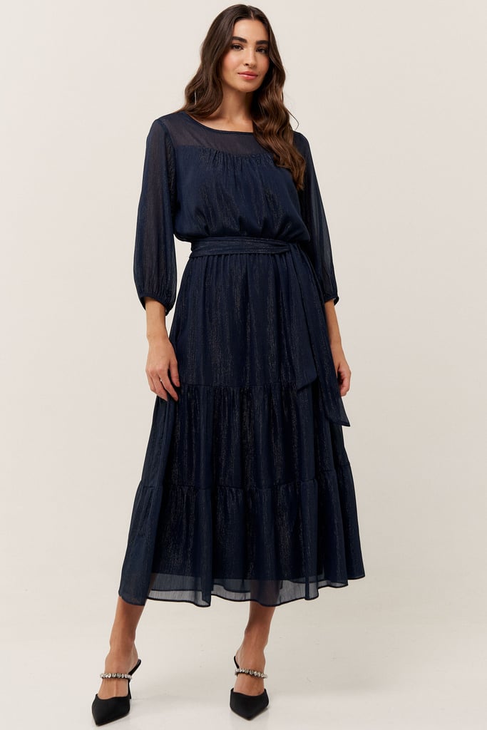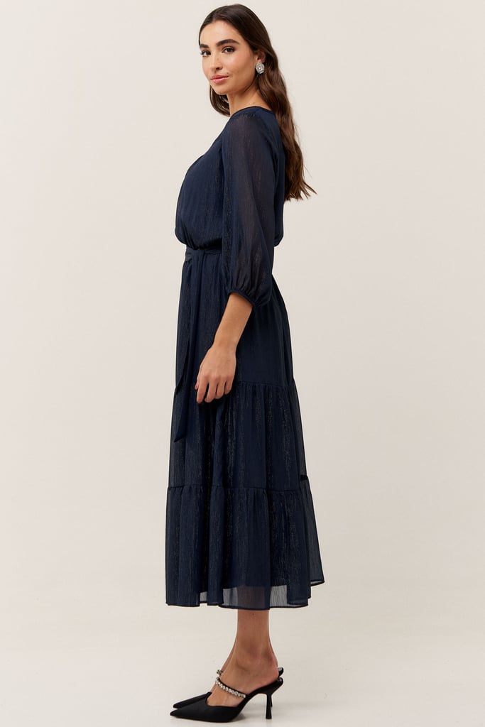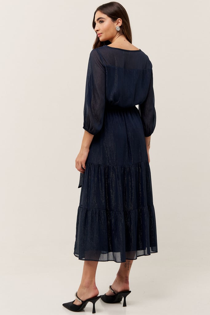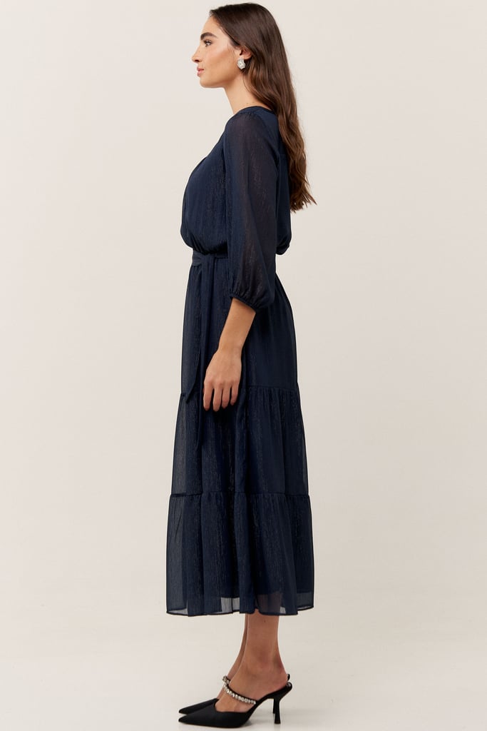 O vestido confeccionado em chiffon texturizado com fio de lurex, possui dois formatos de decotes que se sobrepõe e manga 3/4 com terminação de elástico. Faixa do mesmo tecido costurada na lateral para amarração. Detalhe de babados na saia que dão todo charme à peça. Comprimento midi. Contém forro.