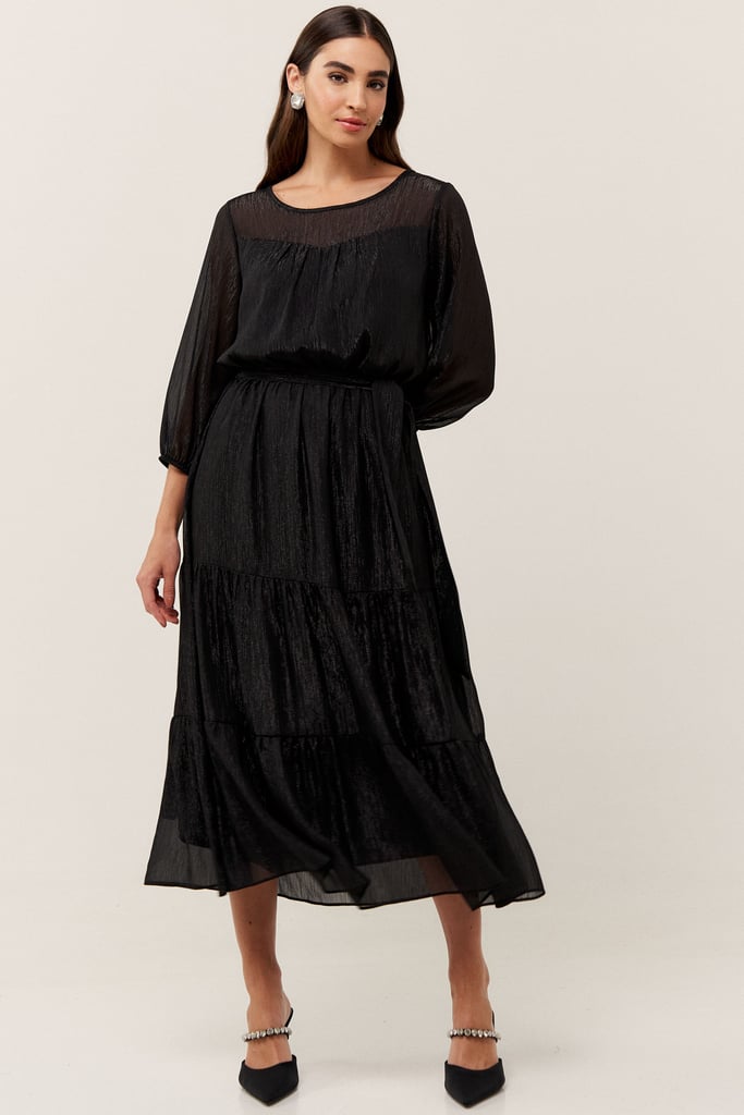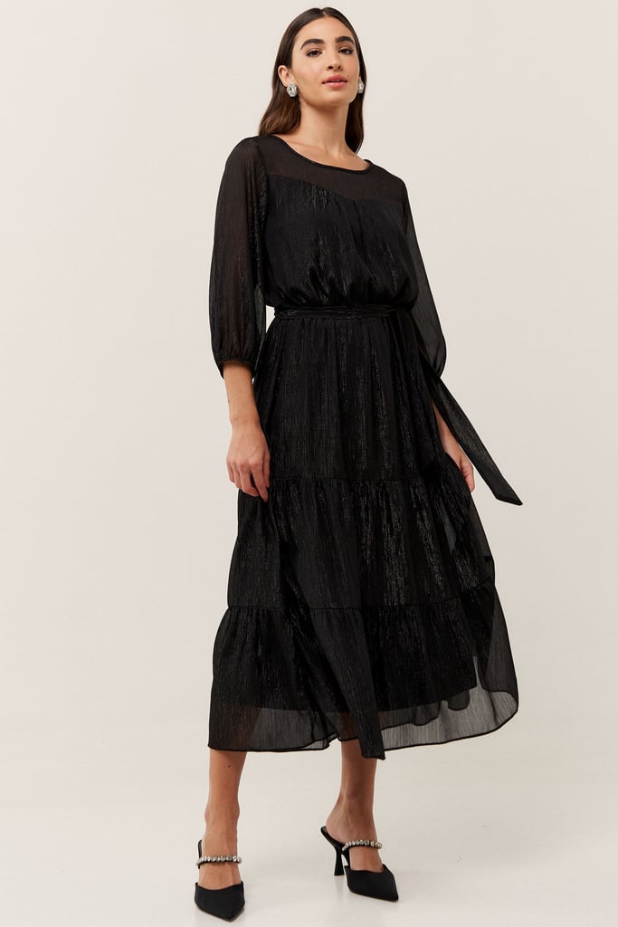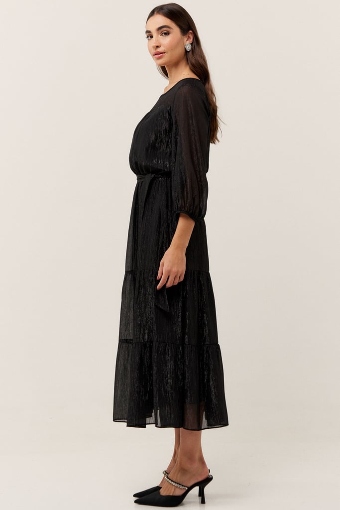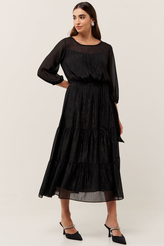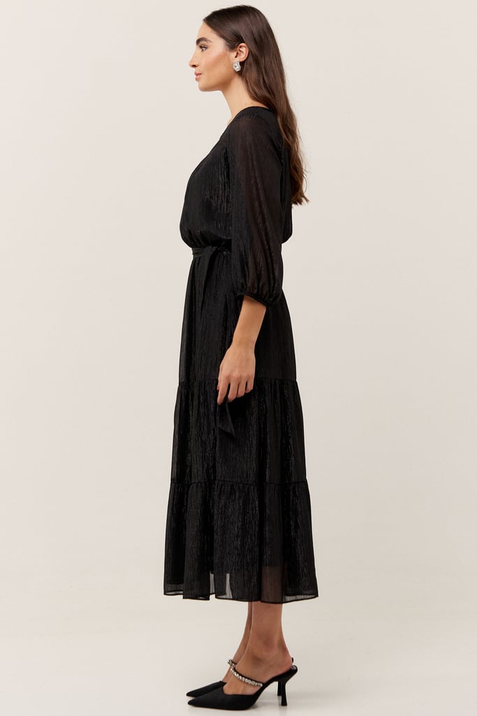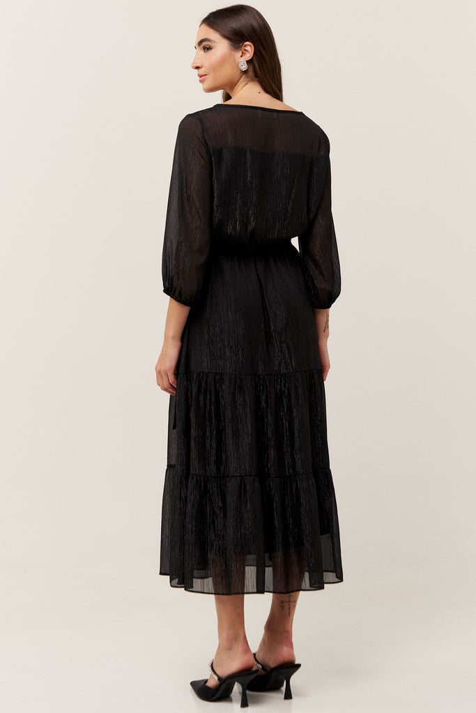 O vestido confeccionado em chiffon texturizado com fio de lurex, possui dois formatos de decotes que se sobrepõe e manga 3/4 com terminação de elástico. Faixa do mesmo tecido costurada na lateral para amarração. Detalhe de babados na saia que dão todo charme à peça. Comprimento midi. Contém forro.