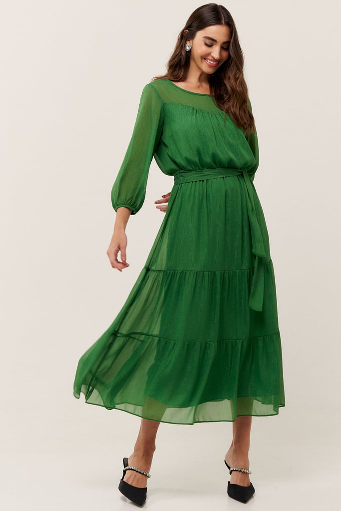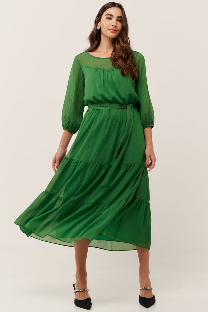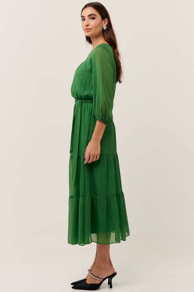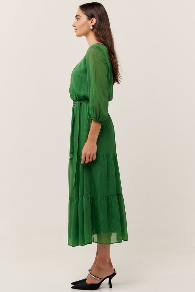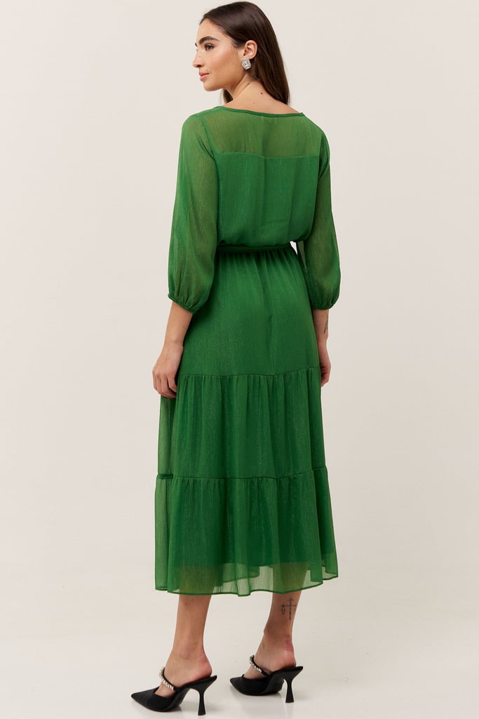 O vestido confeccionado em chiffon texturizado com fio de lurex, possui dois formatos de decotes que se sobrepõe e manga 3/4 com terminação de elástico. Faixa do mesmo tecido costurada na lateral para amarração. Detalhe de babados na saia que dão todo charme à peça. Comprimento midi. Contém forro.