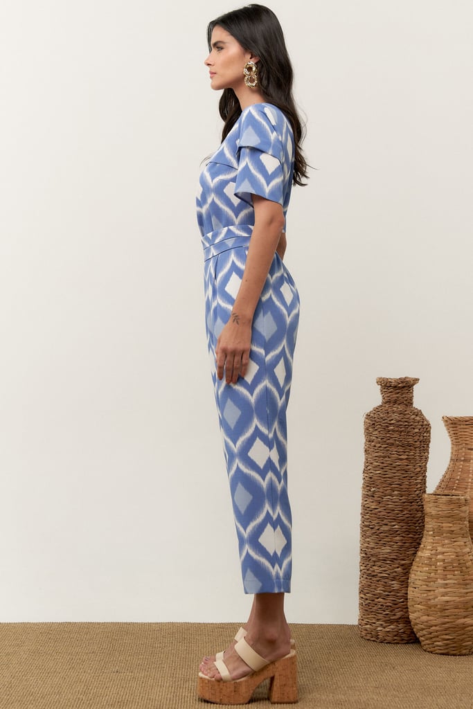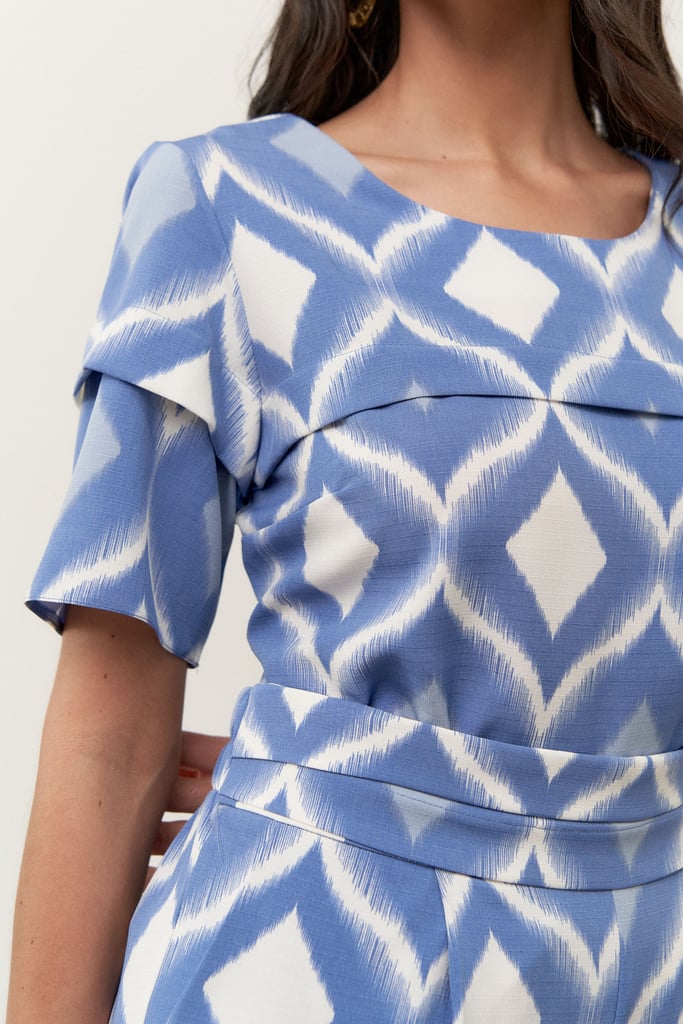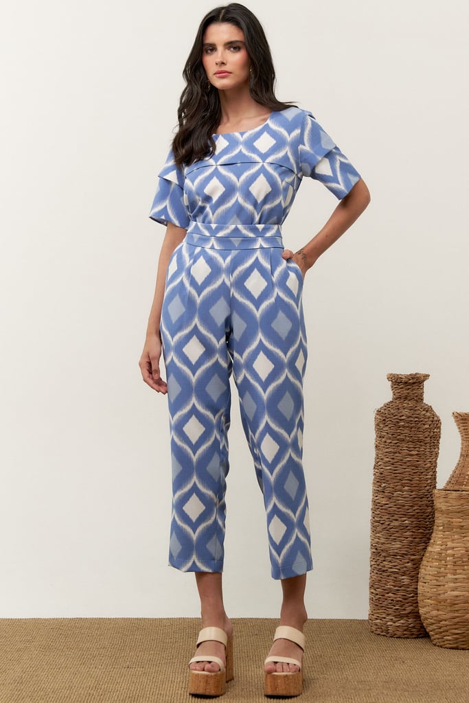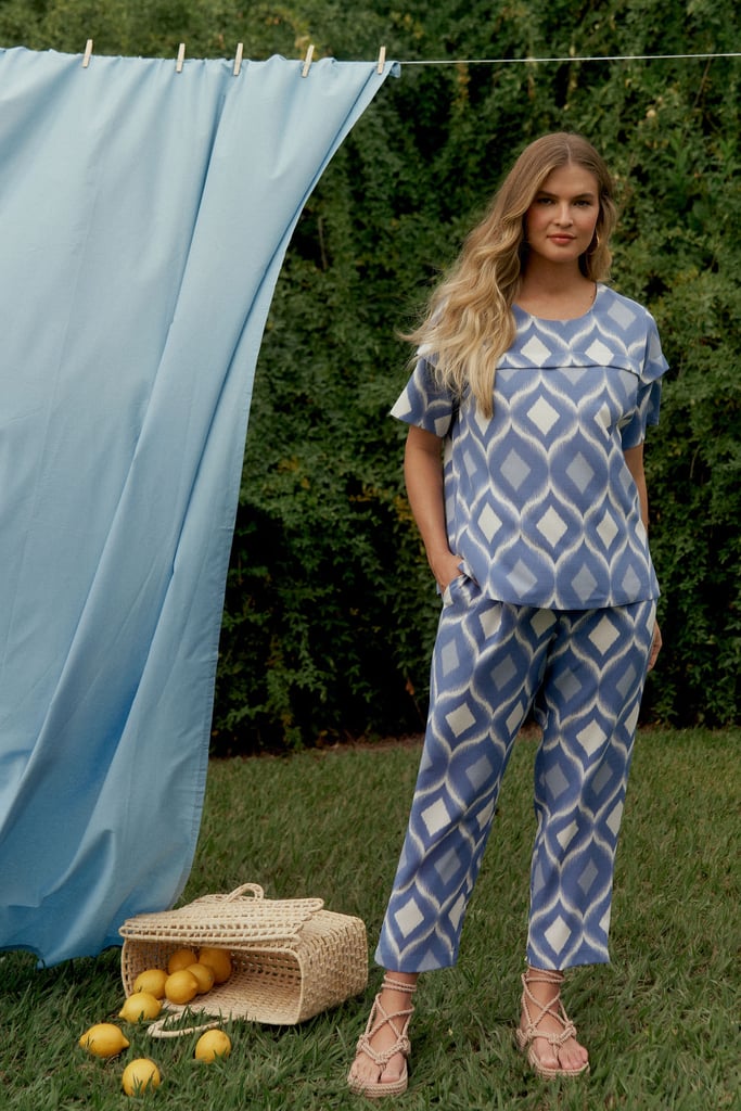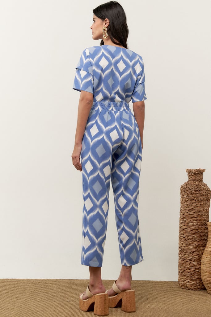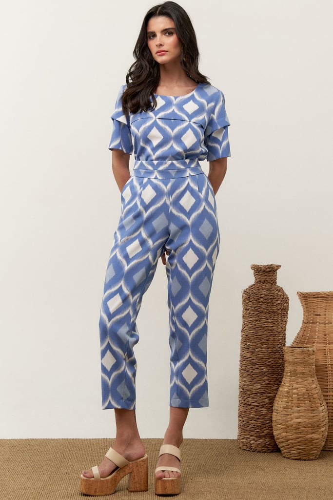 O conjunto confeccionado em tecido de crepe estampado com aspecto de linho, possui blusa com decote redondo e manga curta, e a nossa clássica calça reta com bolsos laterais e cós com elástico nas costas para maior conforto. O charme do conjunto fica por conta dos detalhes de pregas tanto na blusa quanto na calça.