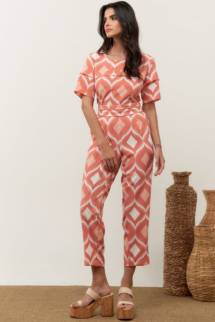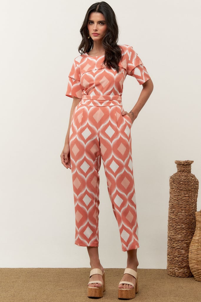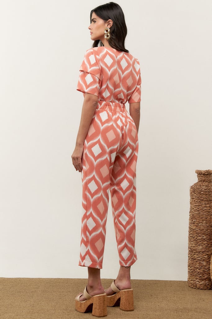 O conjunto confeccionado em tecido de crepe estampado com aspecto de linho, possui blusa com decote redondo e manga curta, e a nossa clássica calça reta com bolsos laterais e cós com elástico nas costas para maior conforto. O charme do conjunto fica por conta dos detalhes de pregas tanto na blusa quanto na calça.