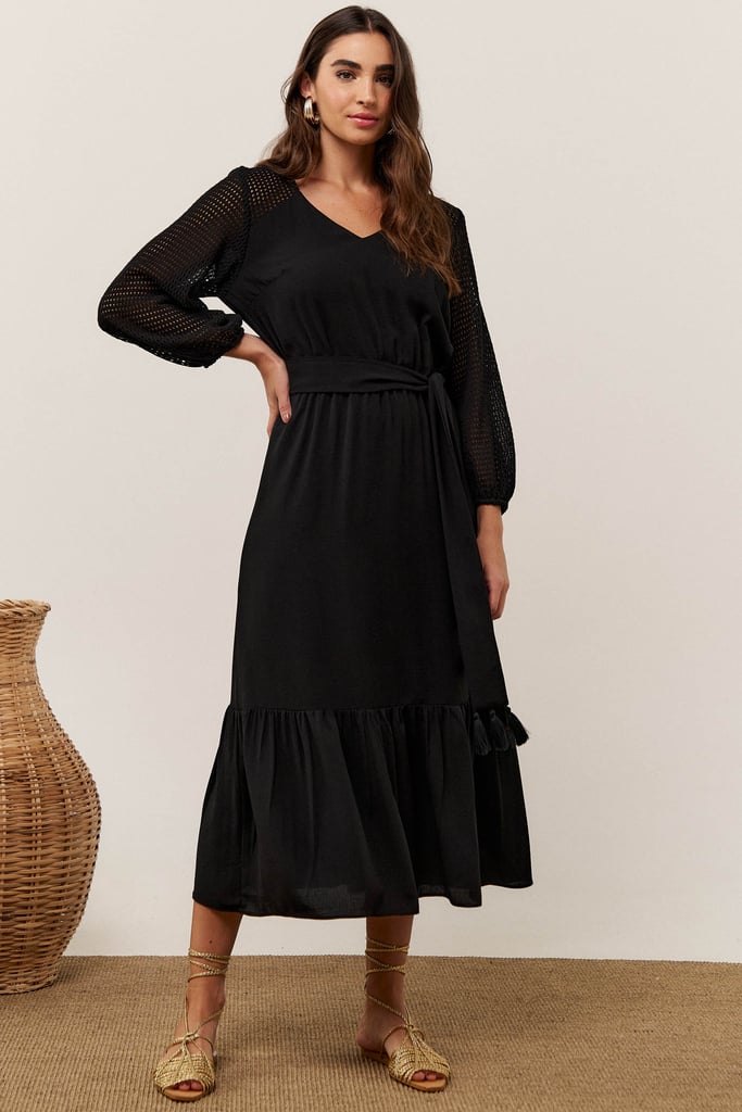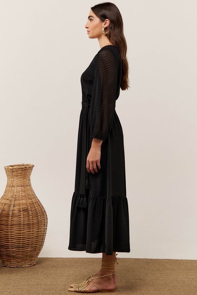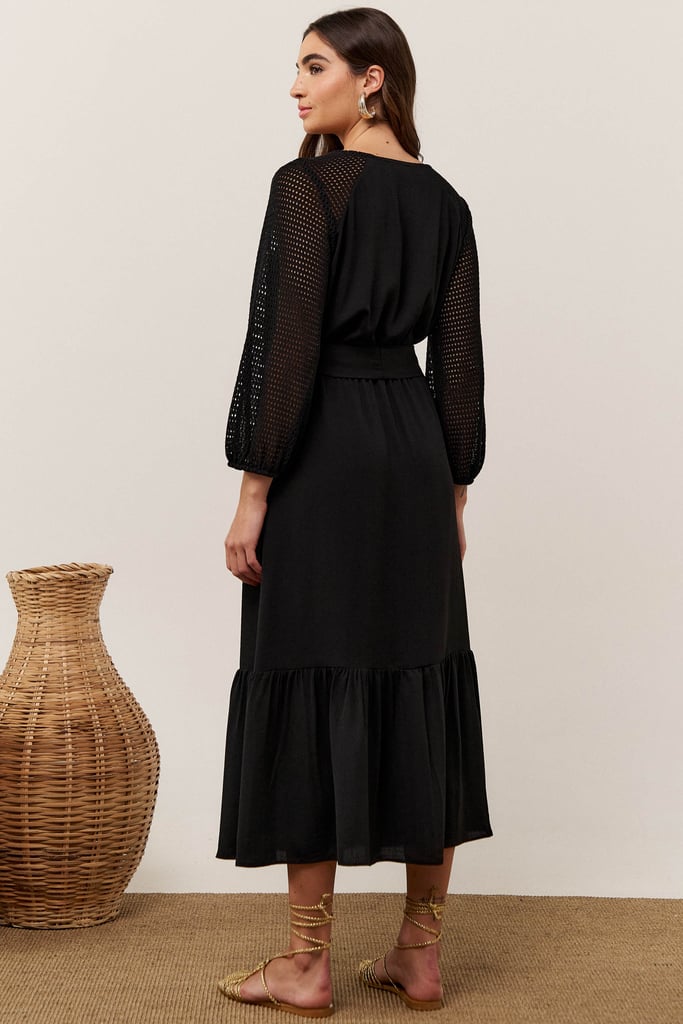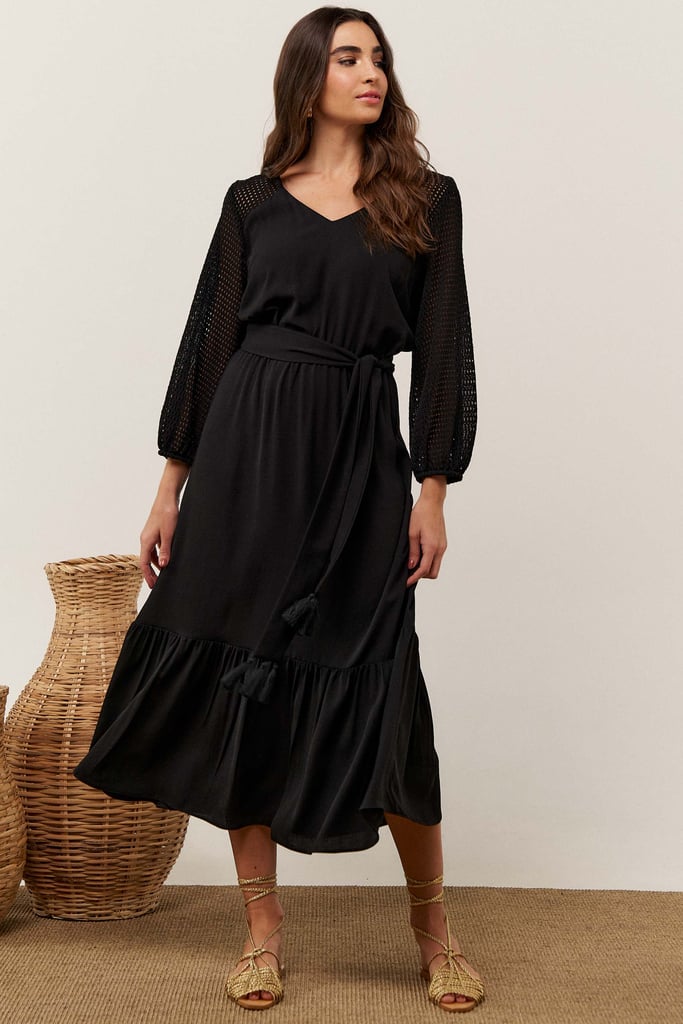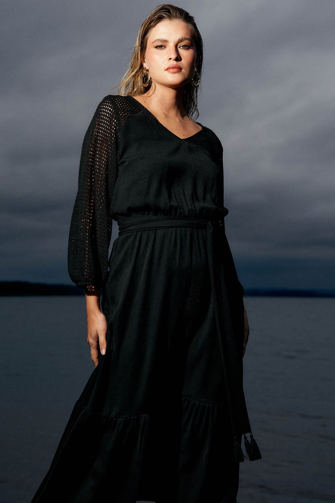 O vestido, confeccionado em crepe liso e manga 3/4 em tricô, possui decote V, elástico interno na cintura para efeito blusê e babado na saia. Acompanha faixa do mesmo tecido para amarração com detalhe de tecel.