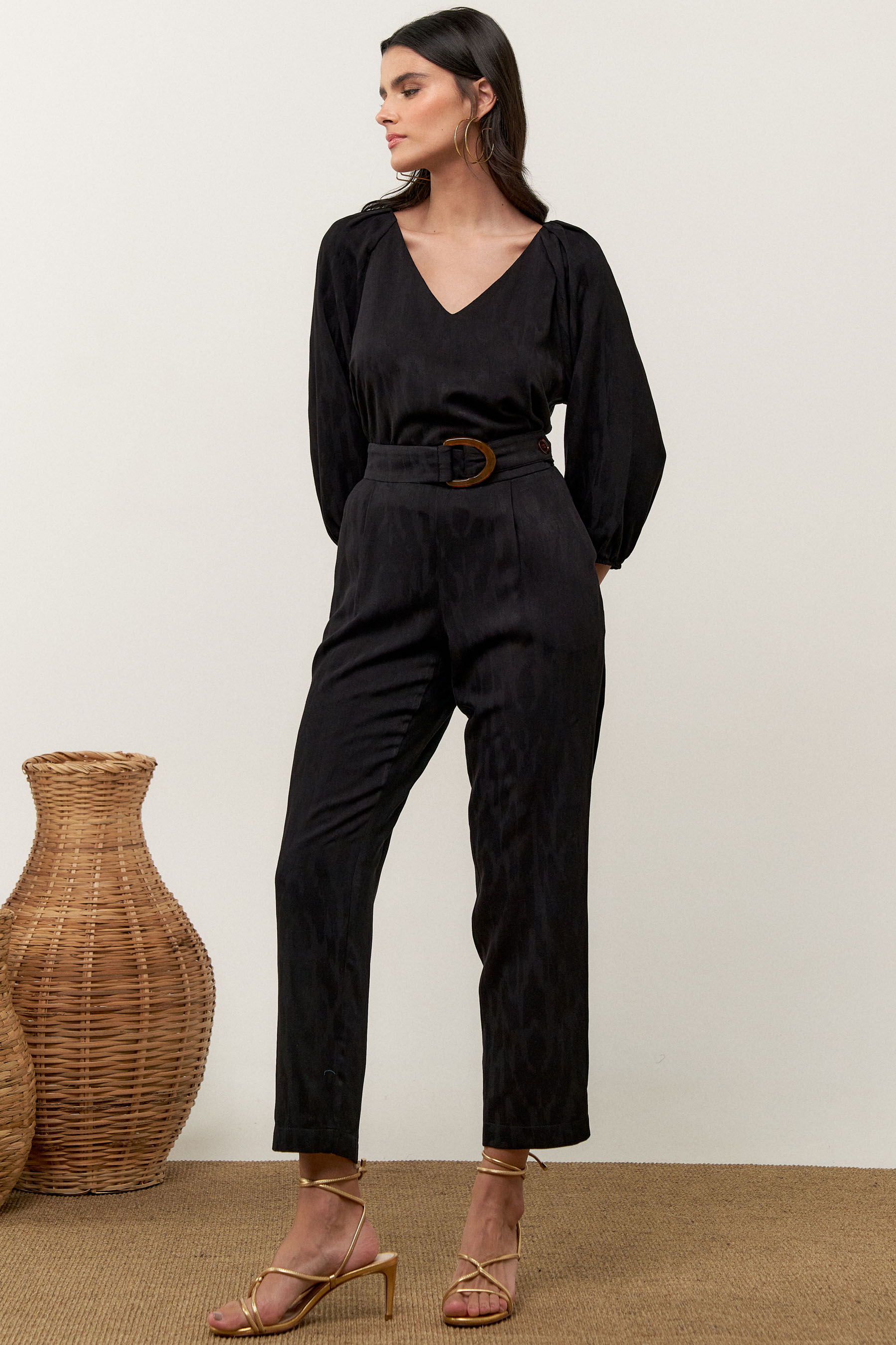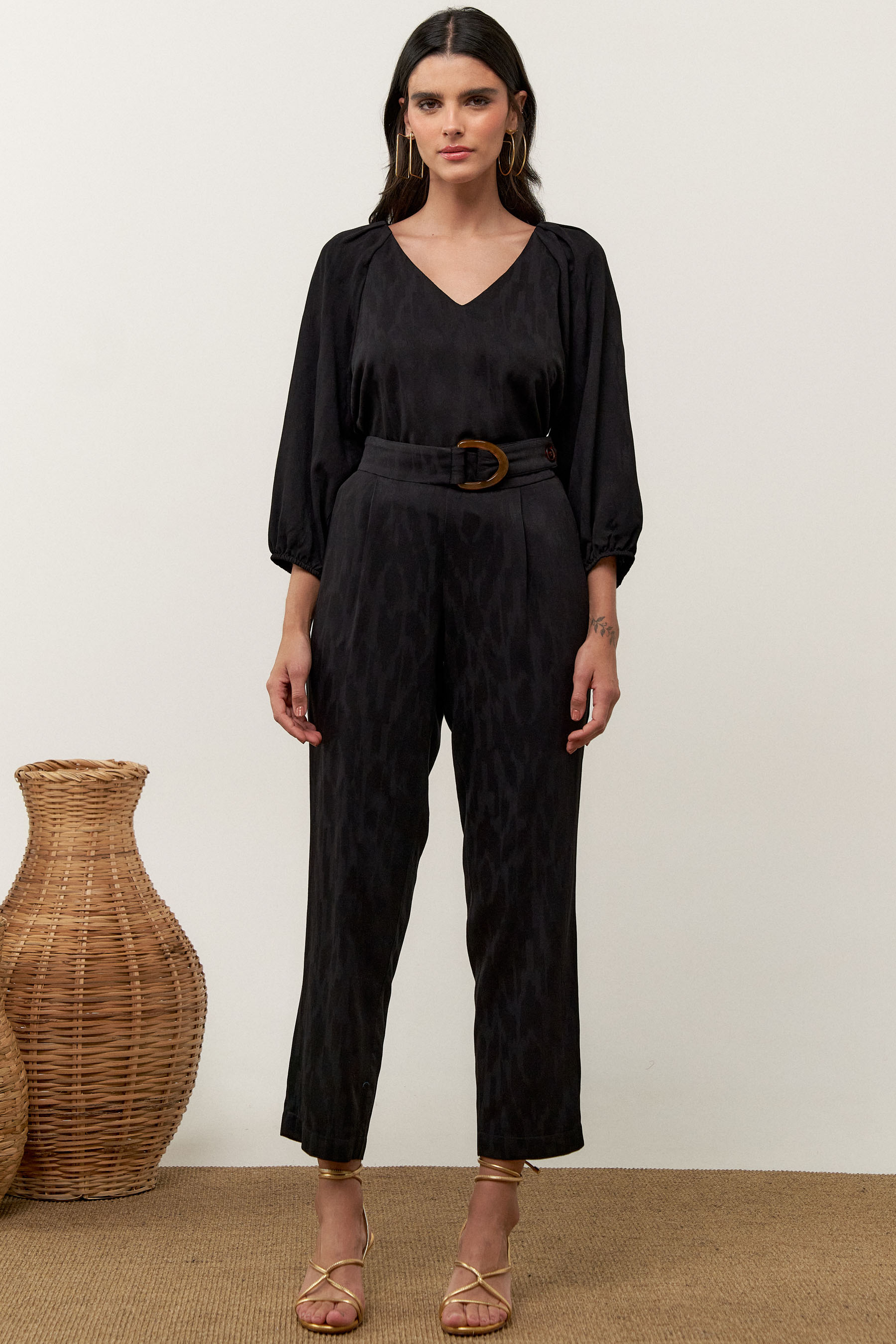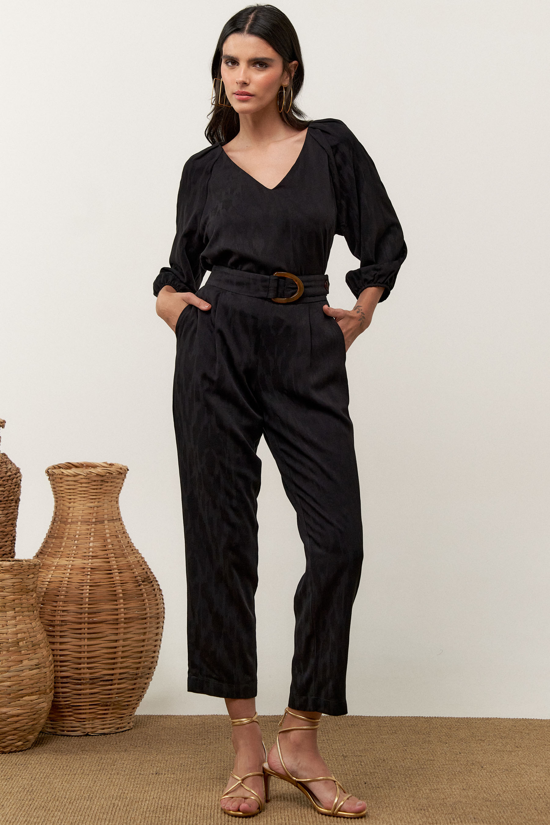 Conjunto de blusa e calça confeccionado em tecido de crepe maquinetado. A blusa possui decote V, pregas nos ombros e manga 3/4 com elástico na barra. Calça traz nossa modelagem clássica reta com pregas frontais, bolsos laterais e cós com elástico nas costas para maior conforto. Detalhe de martingale, fivela e botão no cós frontal.