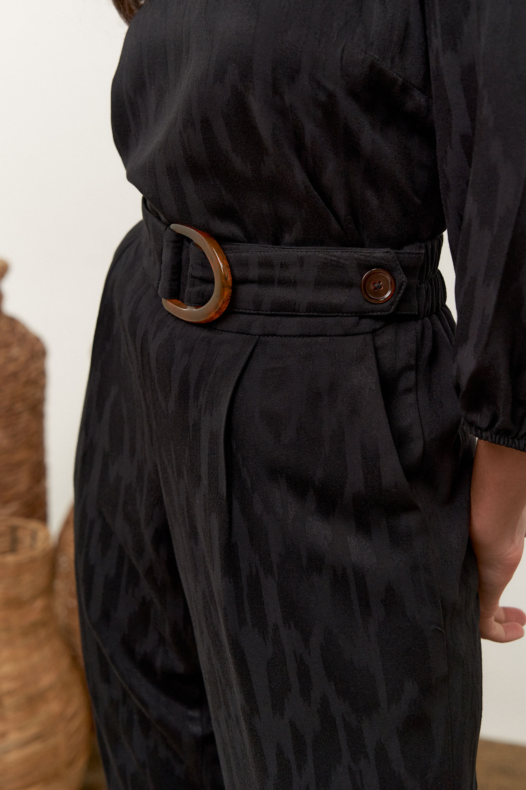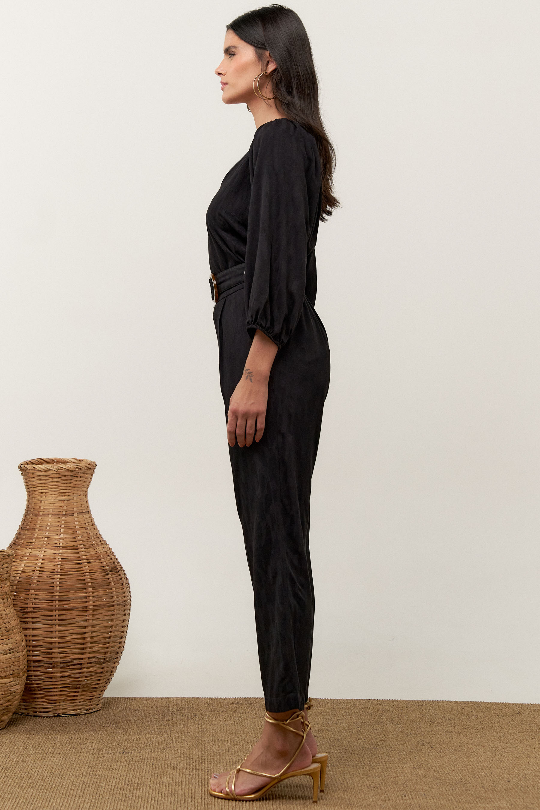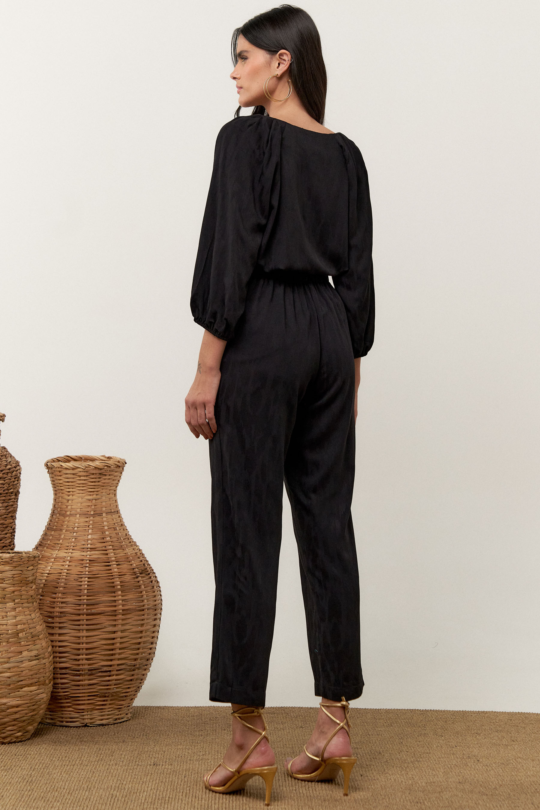 Conjunto de blusa e calça confeccionado em tecido de crepe maquinetado. A blusa possui decote V, pregas nos ombros e manga 3/4 com elástico na barra. Calça traz nossa modelagem clássica reta com pregas frontais, bolsos laterais e cós com elástico nas costas para maior conforto. Detalhe de martingale, fivela e botão no cós frontal.